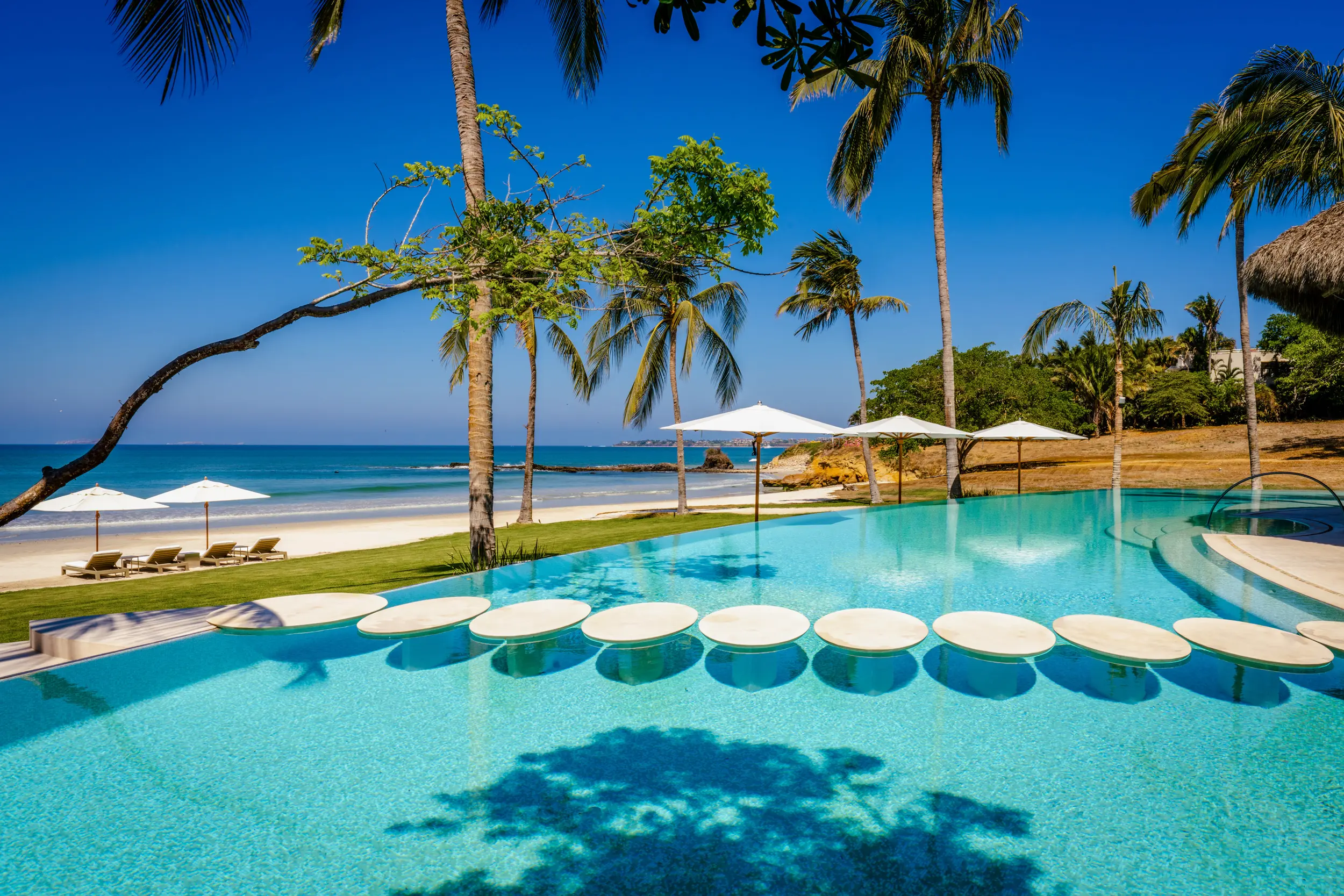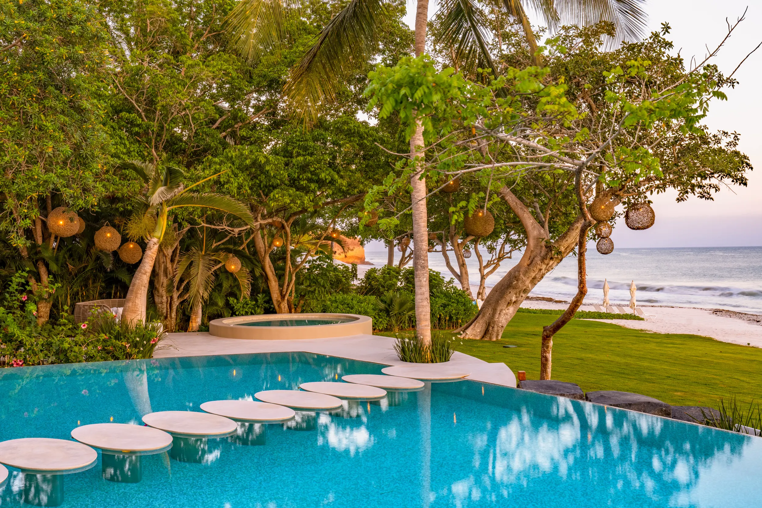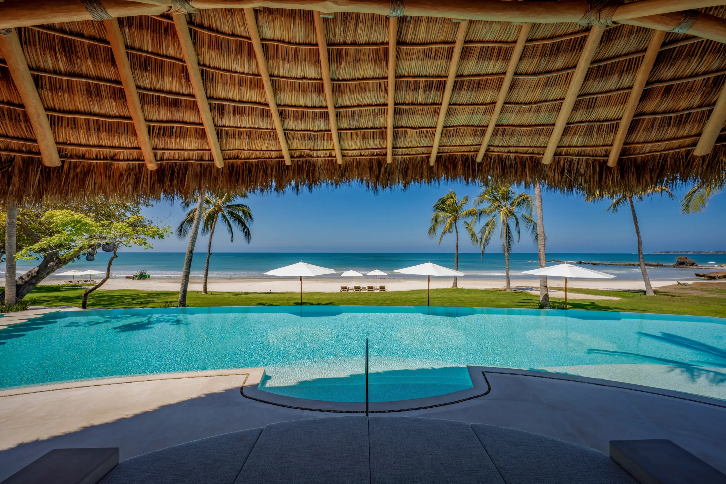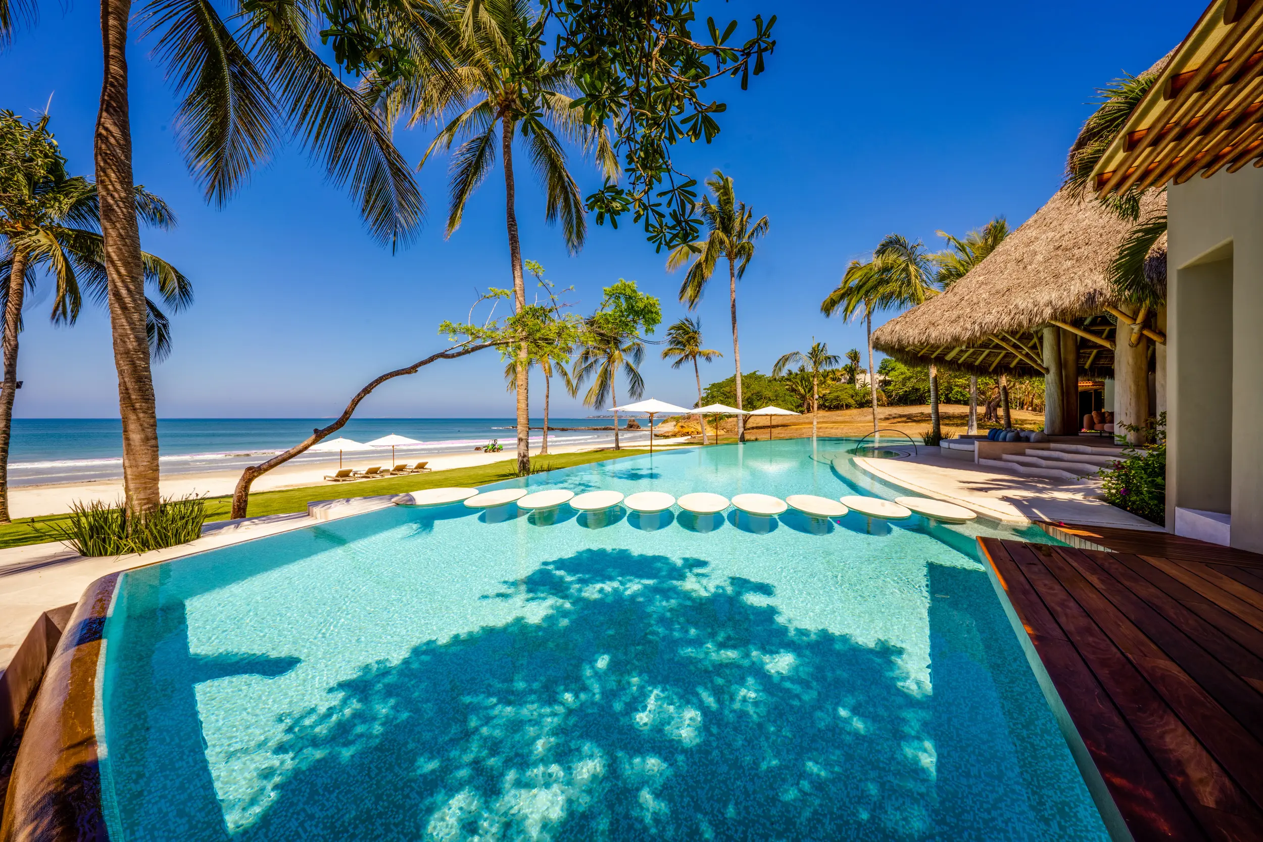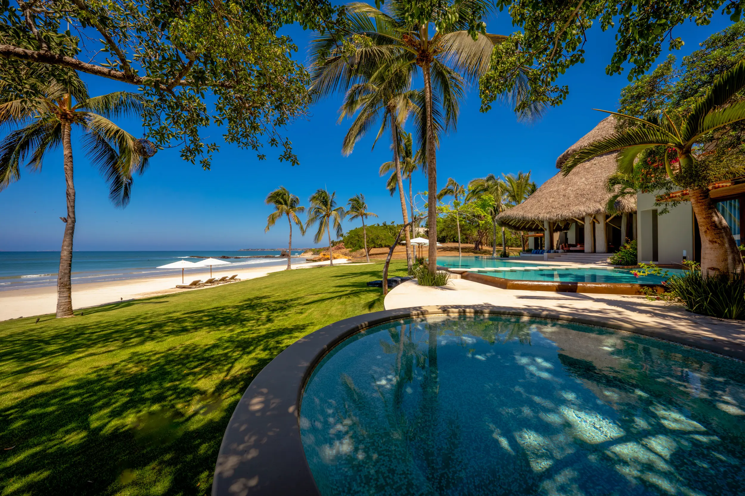 At the heart of the property, a massive heated infinity pool appears to spill directly into the ocean, flanked by an oversized hot tub that invites long, leisurely soaks under the sun or stars. Just beyond, direct access to one of Punta Mita’s finest swimmable white sand beaches places turquoise waters and soft surf mere steps from the villa, setting the stage for languid, sun-drenched days on the shore.