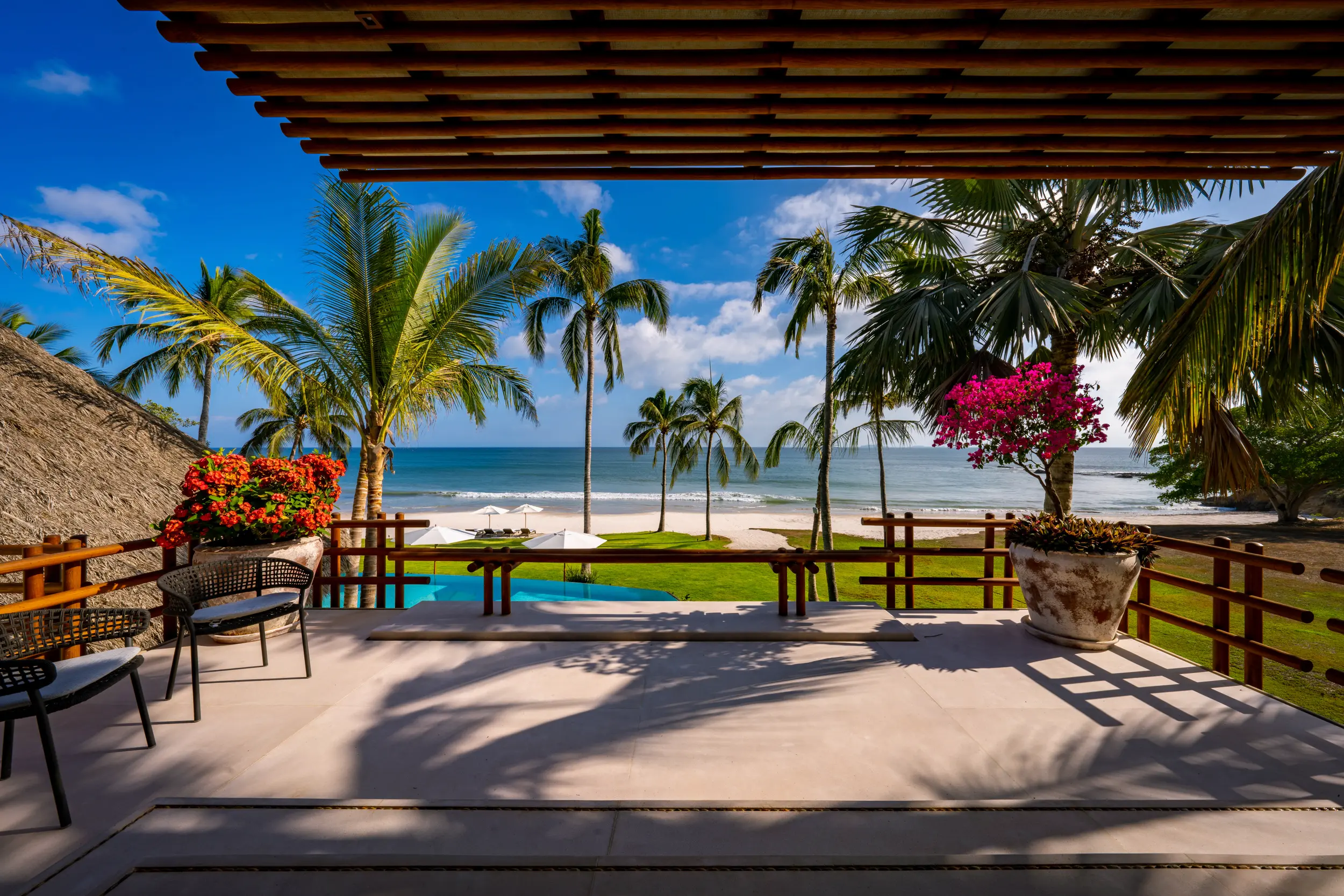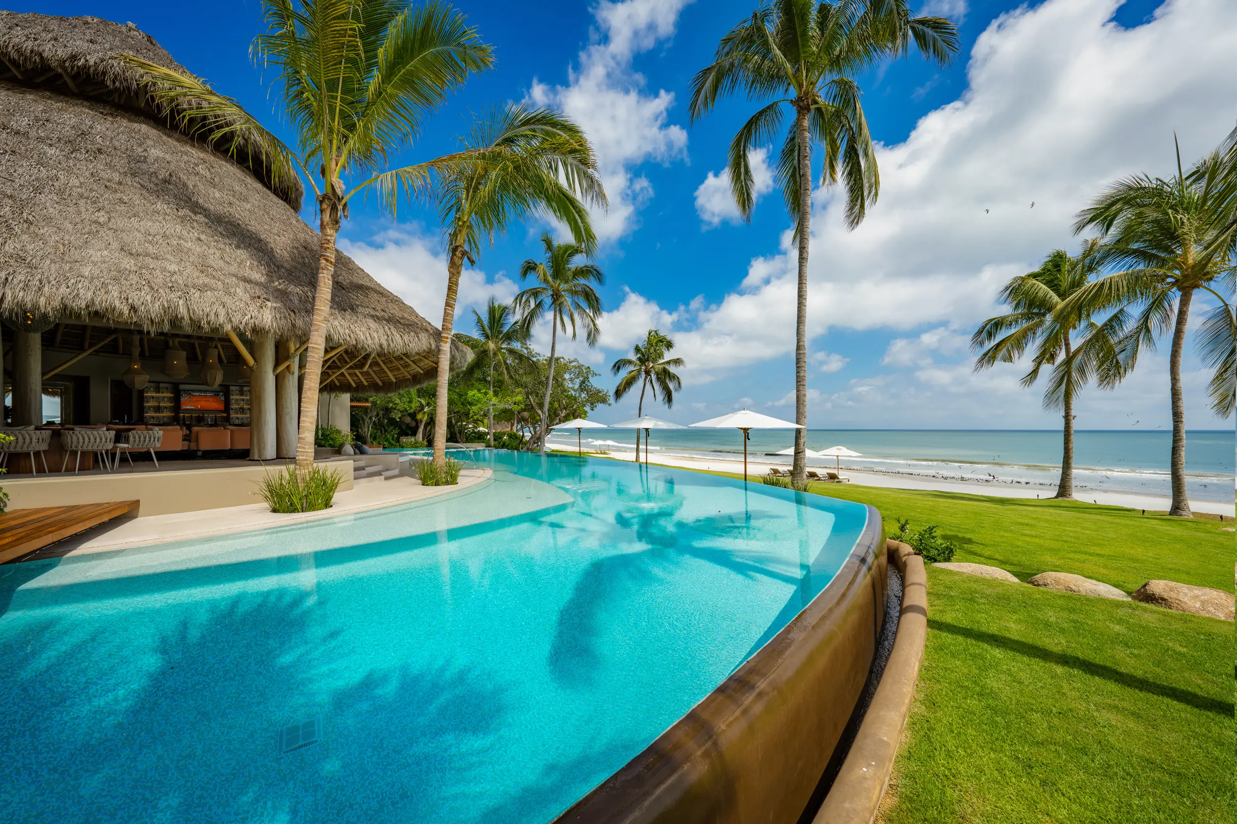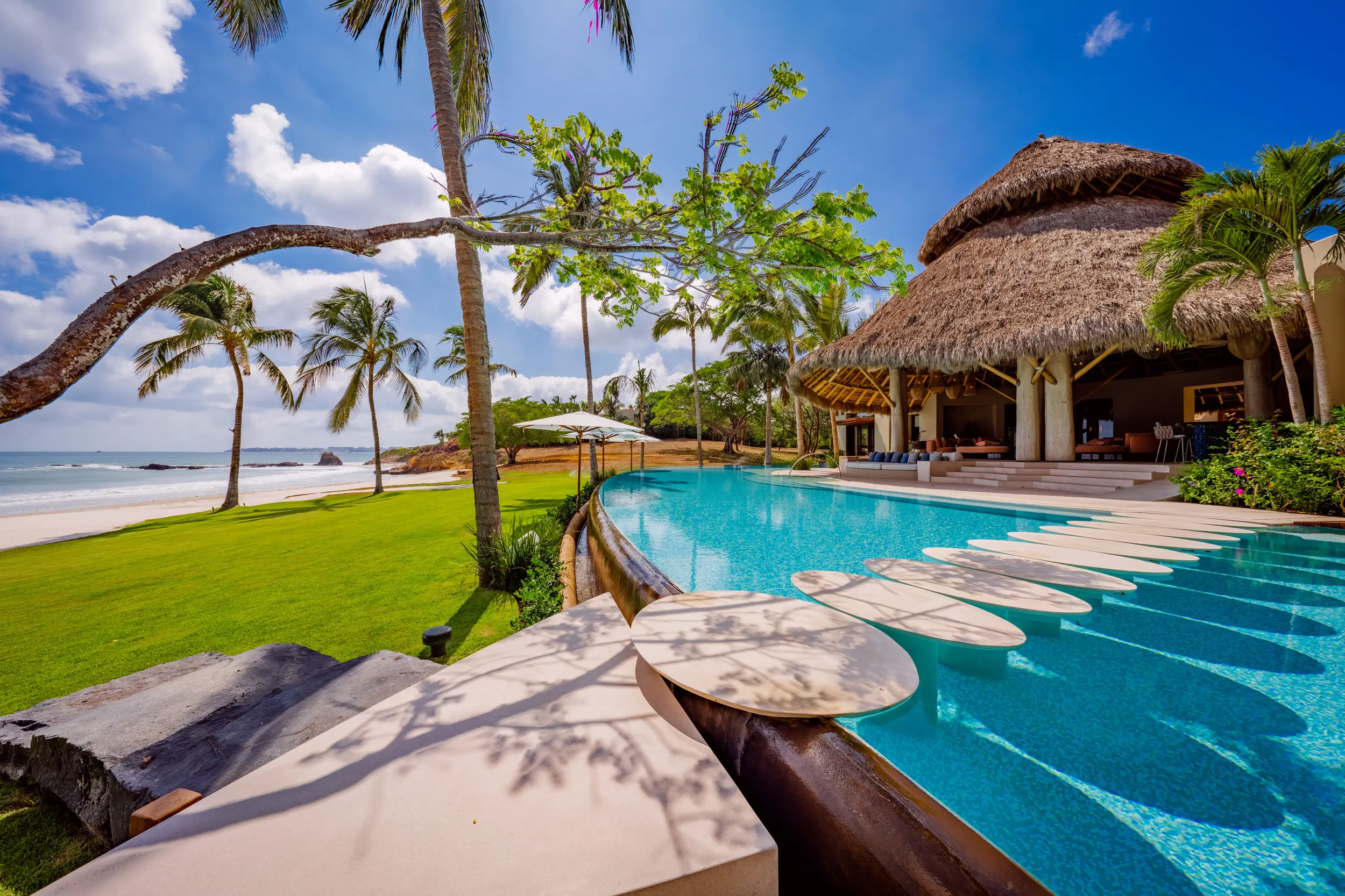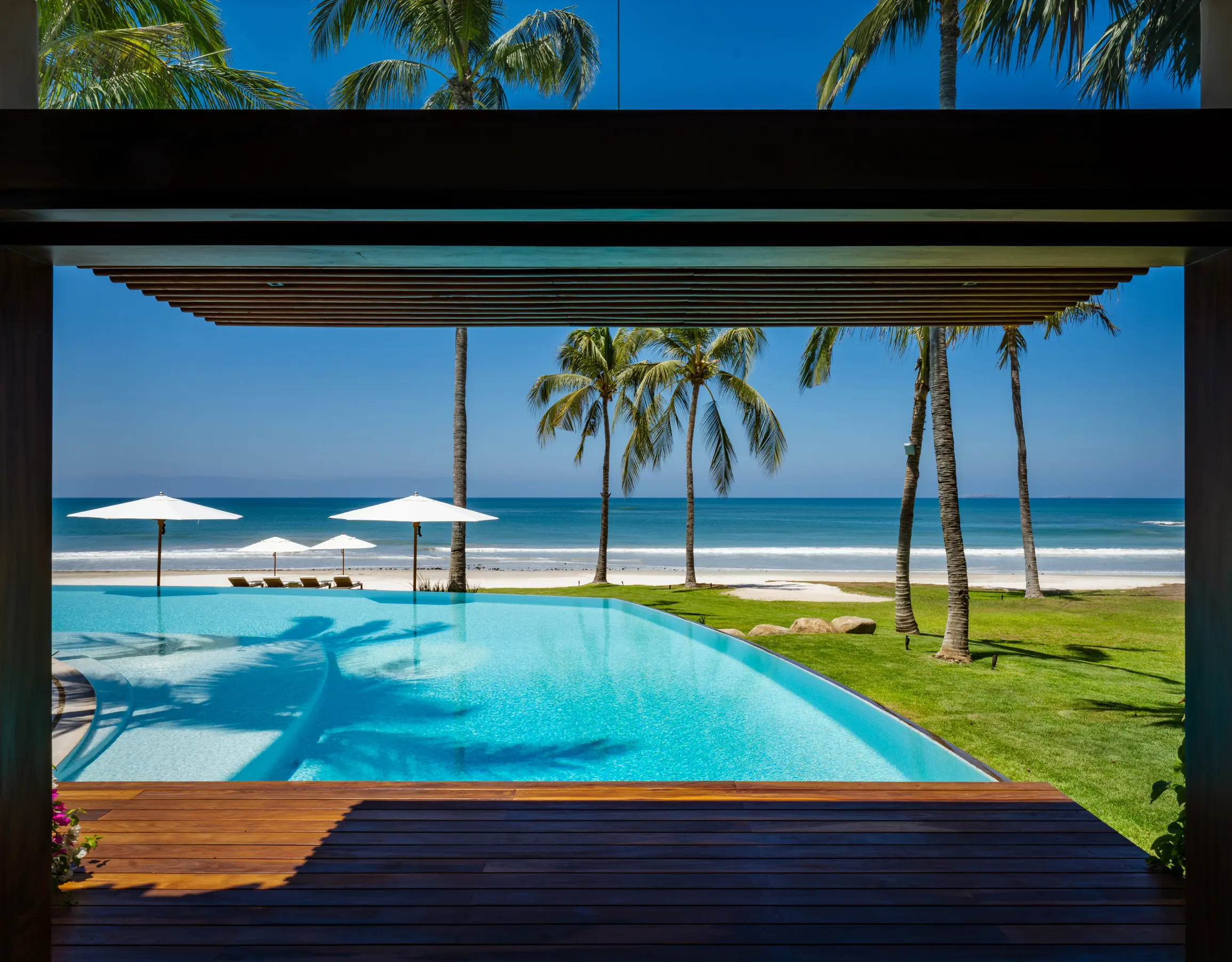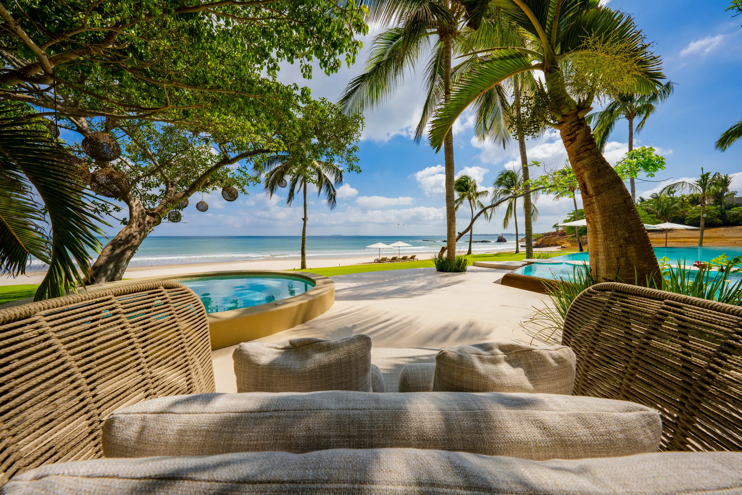 At the heart of the property, a massive heated infinity pool appears to spill directly into the ocean, flanked by an oversized hot tub that invites long, leisurely soaks under the sun or stars. Just beyond, direct access to one of Punta Mita’s finest swimmable white sand beaches places turquoise waters and soft surf mere steps from the villa, setting the stage for languid, sun-drenched days on the shore.