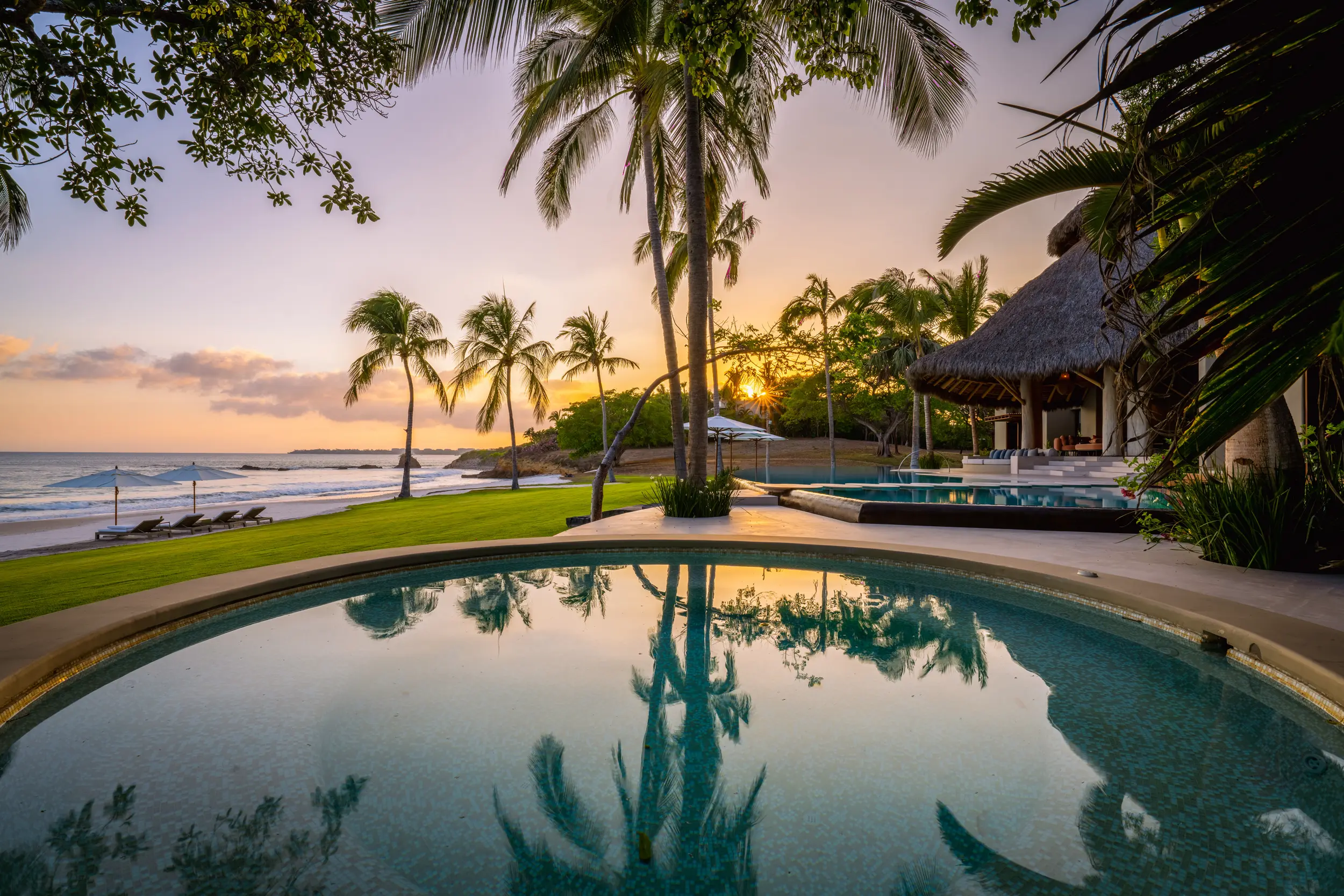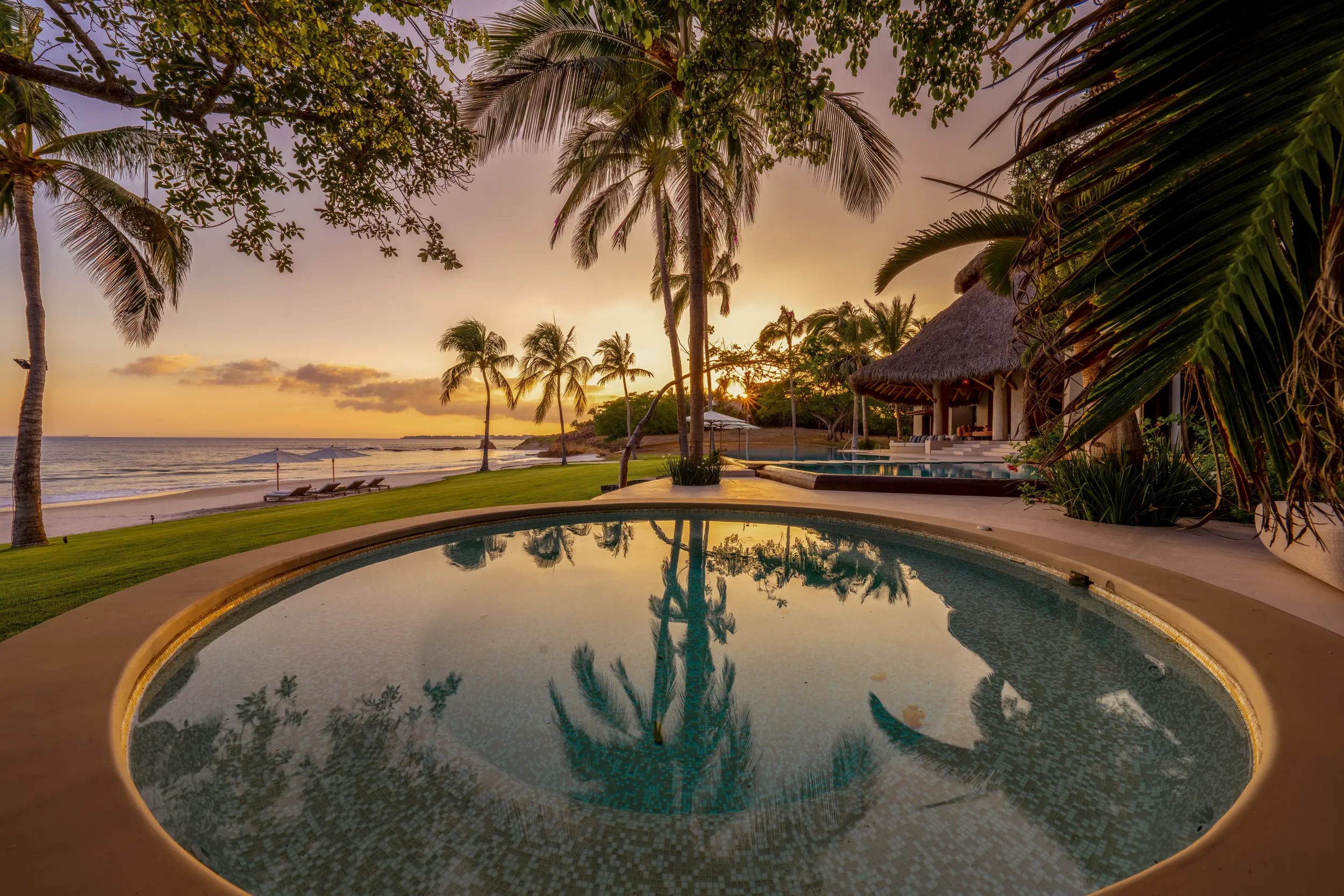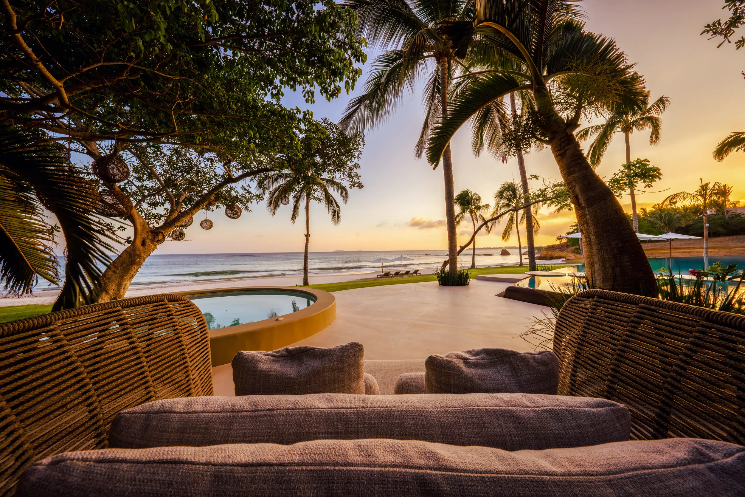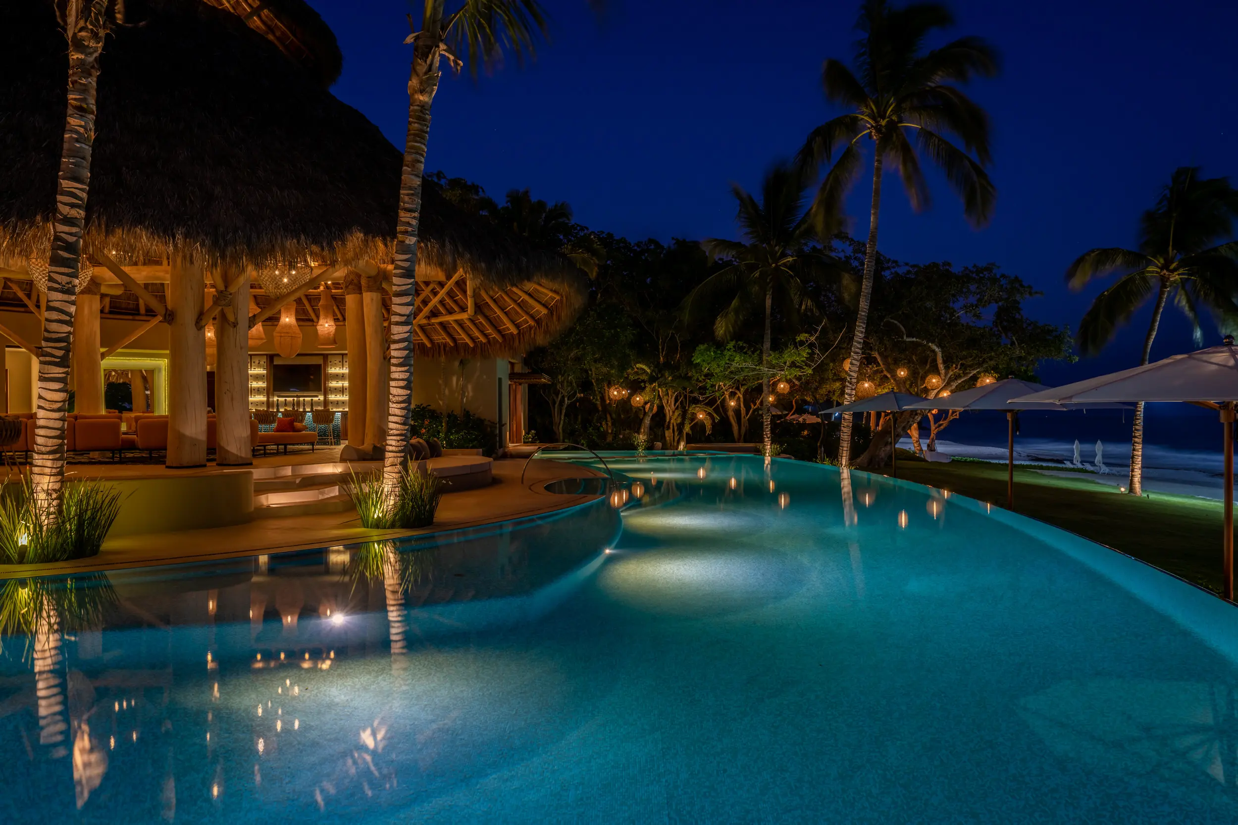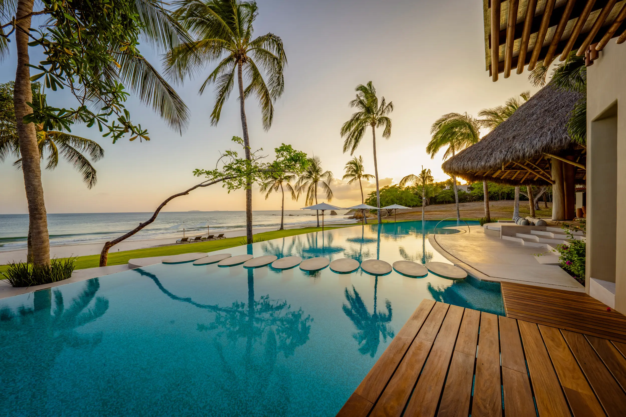 At the heart of the property, a massive heated infinity pool appears to spill directly into the ocean, flanked by an oversized hot tub that invites long, leisurely soaks under the sun or stars. Just beyond, direct access to one of Punta Mita’s finest swimmable white sand beaches places turquoise waters and soft surf mere steps from the villa, setting the stage for languid, sun-drenched days on the shore.