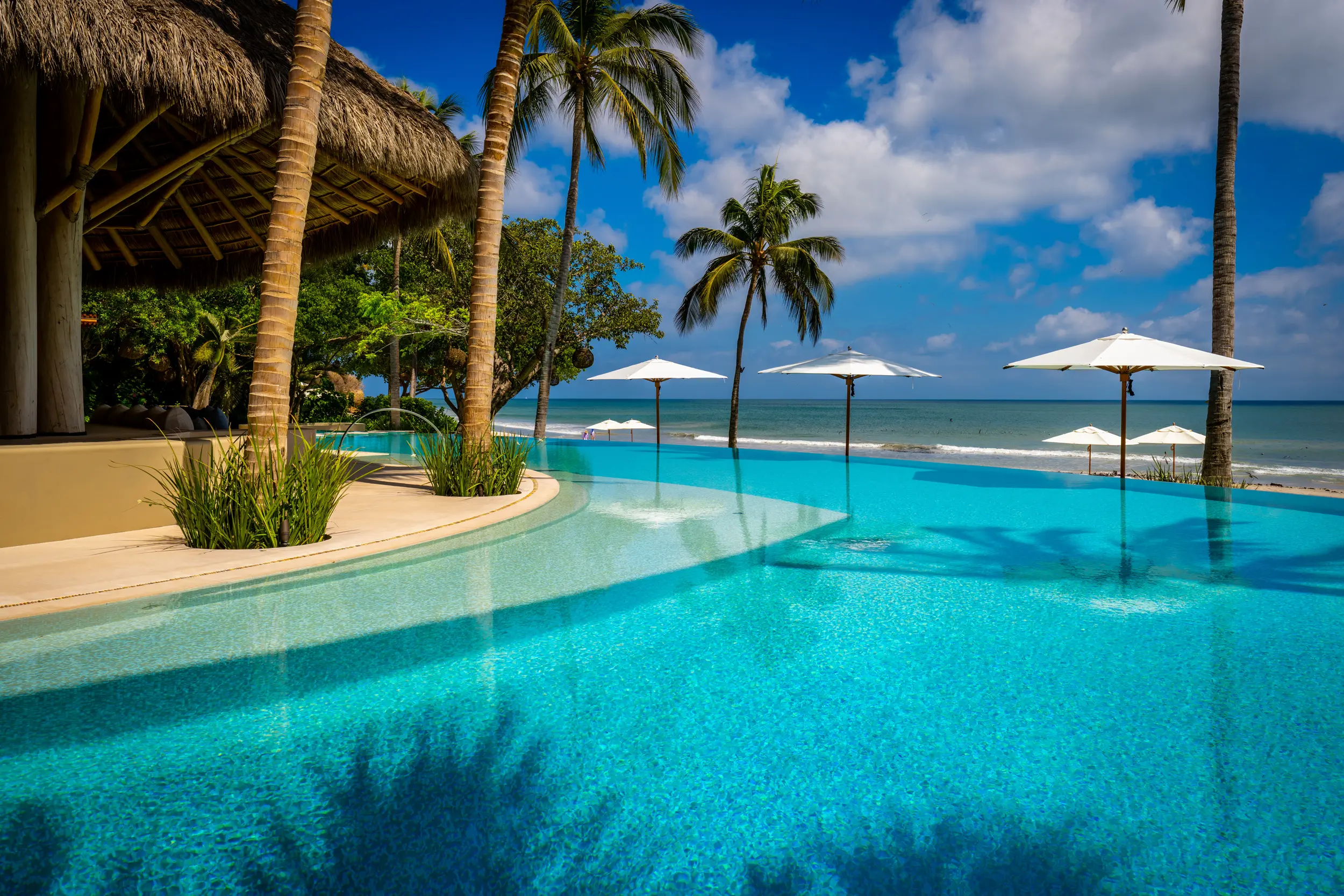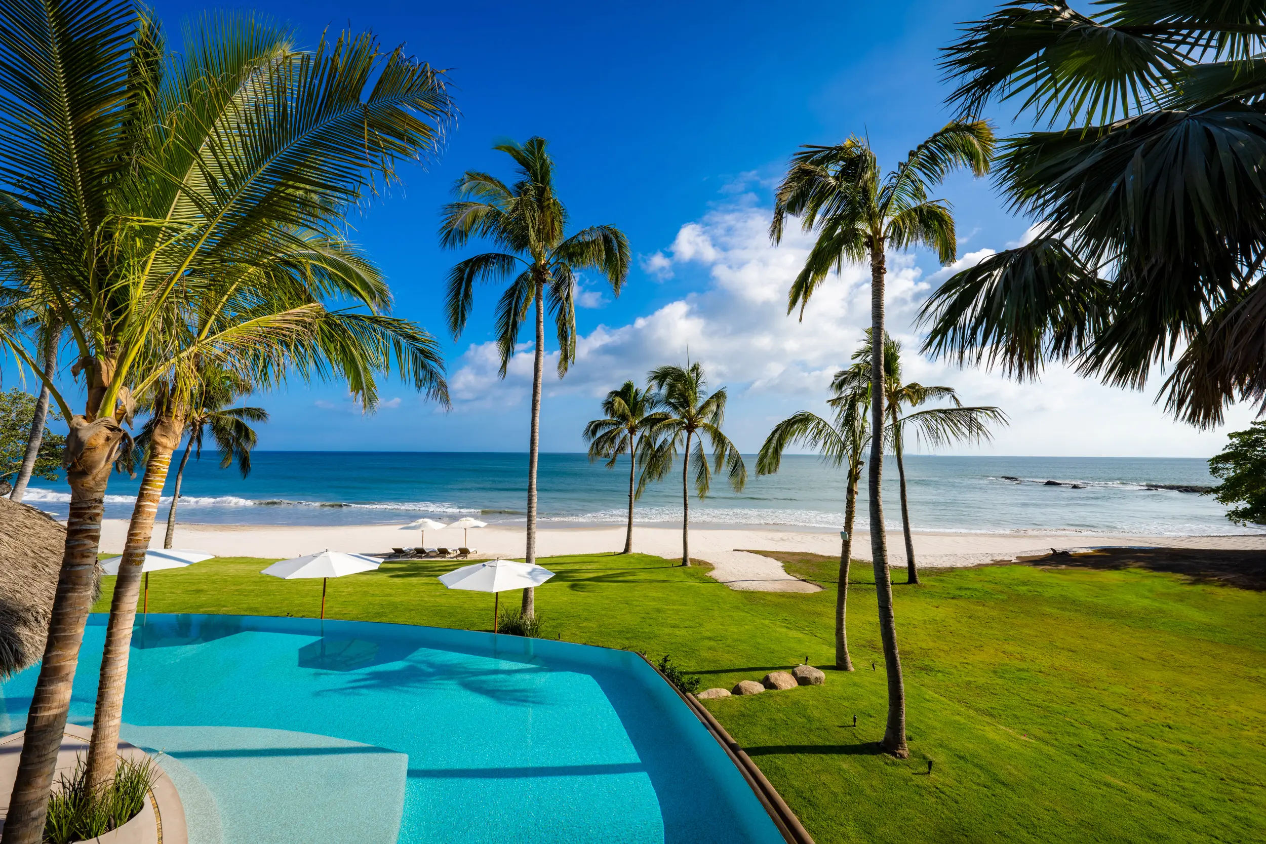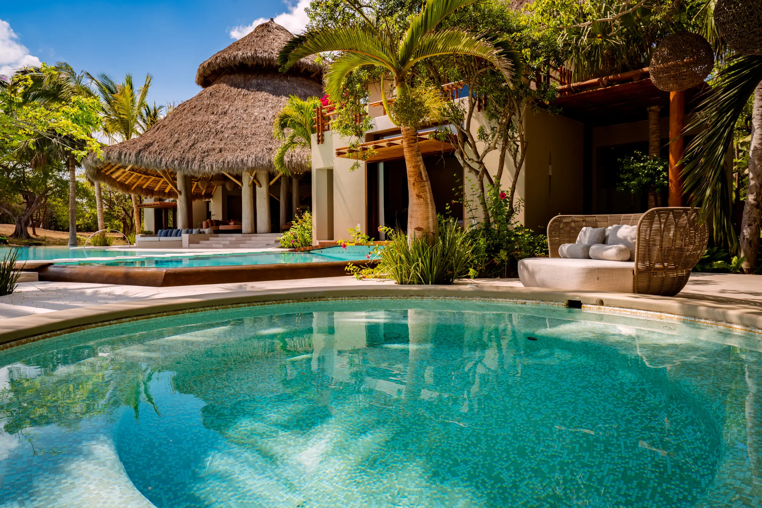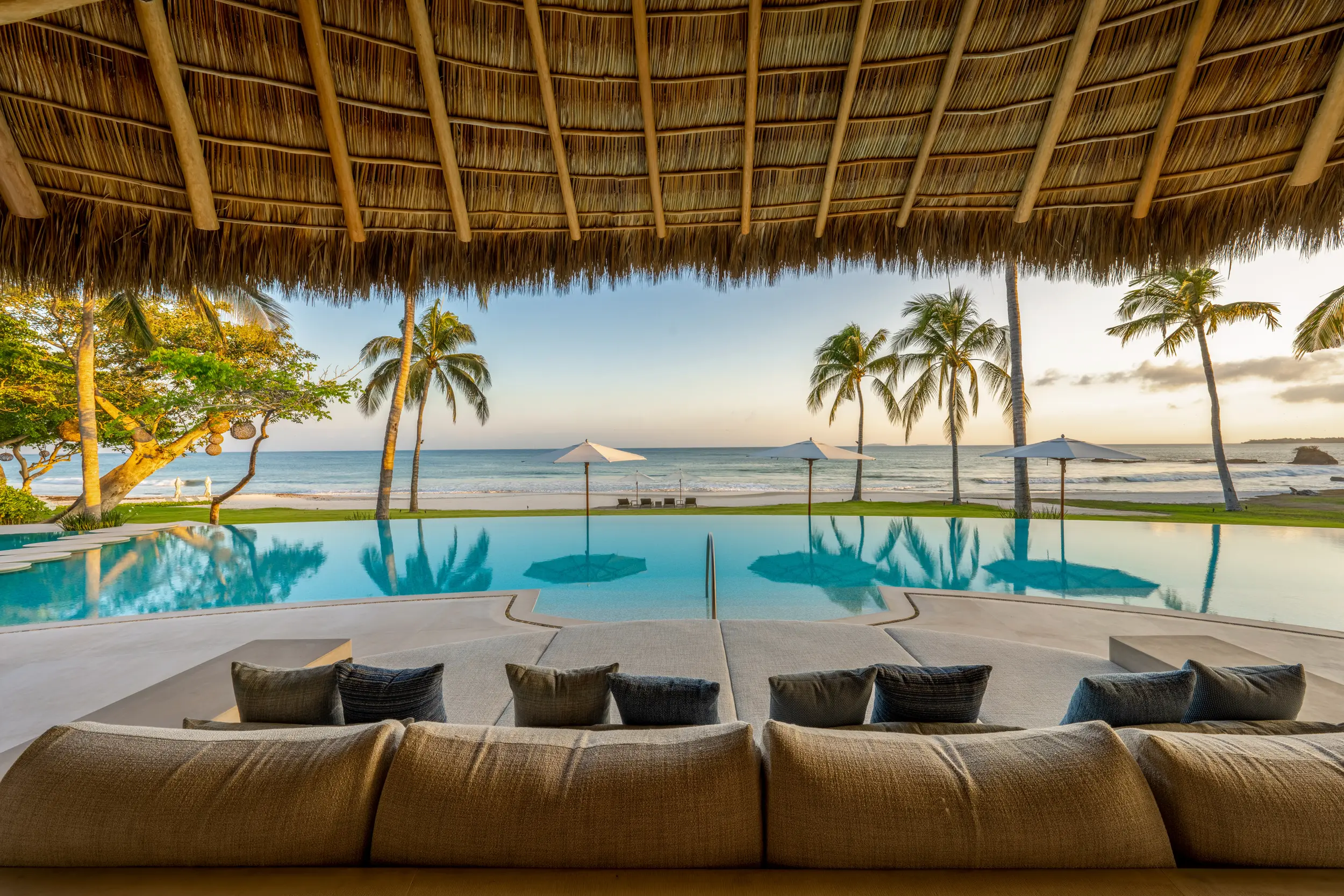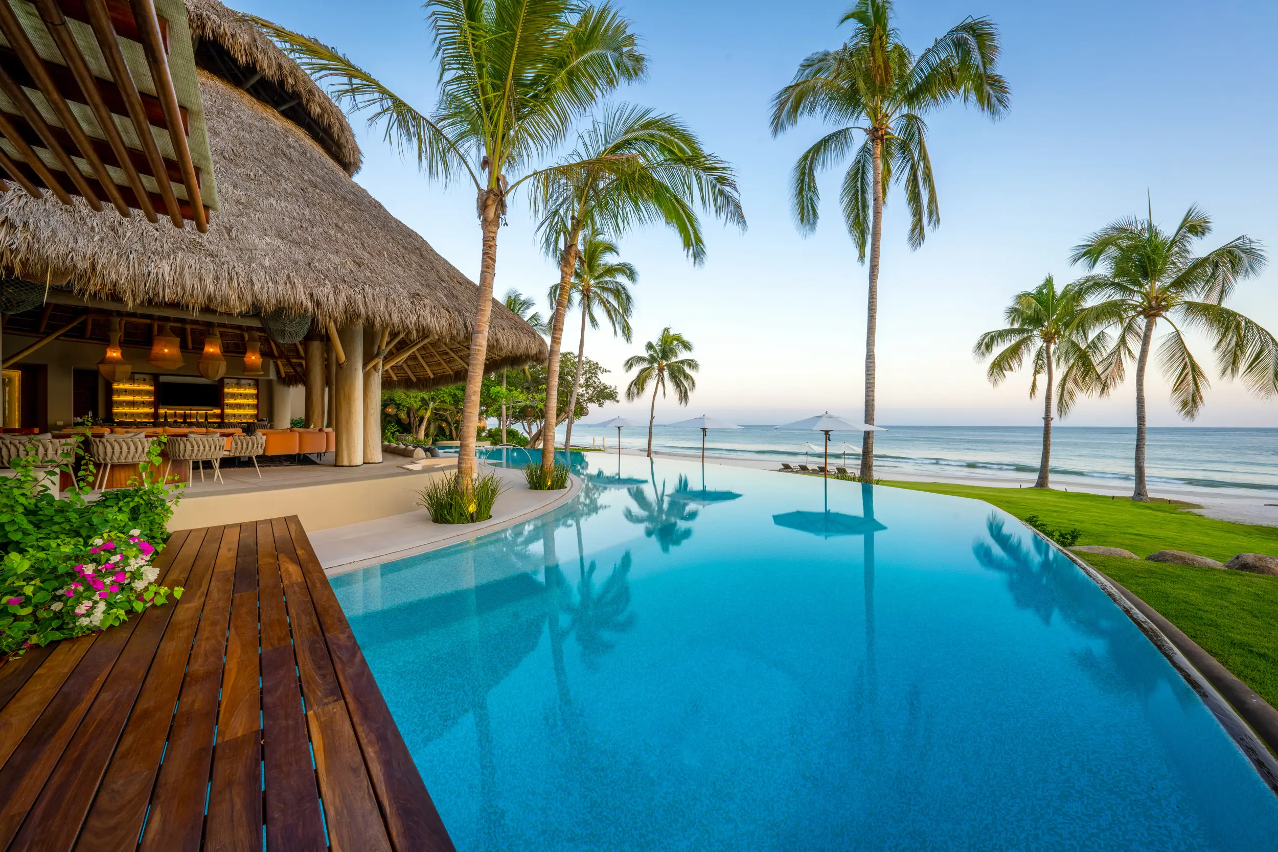 At the heart of the property, a massive heated infinity pool appears to spill directly into the ocean, flanked by an oversized hot tub that invites long, leisurely soaks under the sun or stars. Just beyond, direct access to one of Punta Mita’s finest swimmable white sand beaches places turquoise waters and soft surf mere steps from the villa, setting the stage for languid, sun-drenched days on the shore.