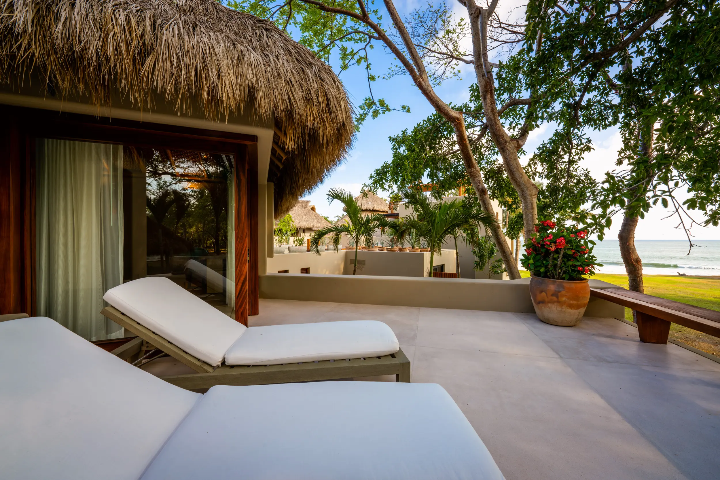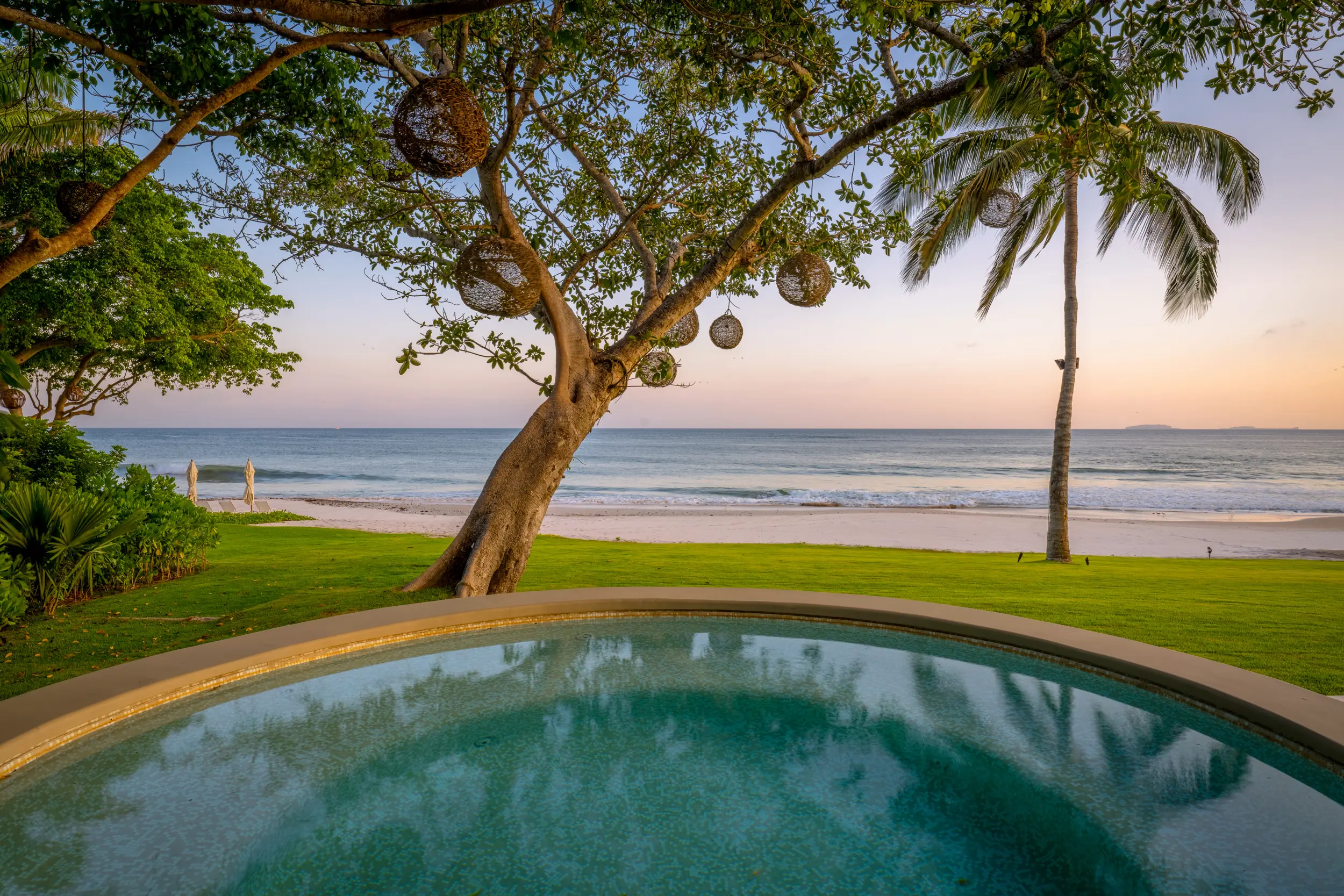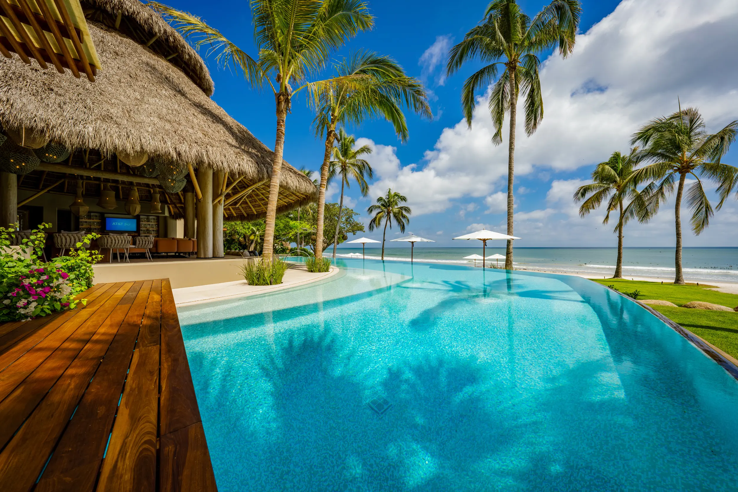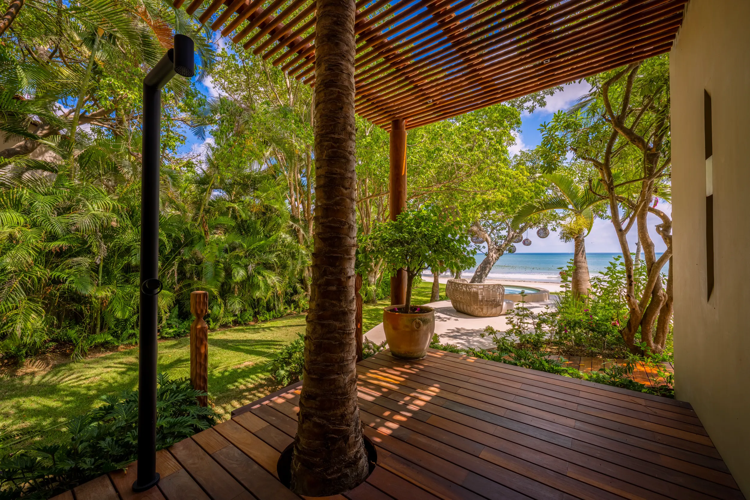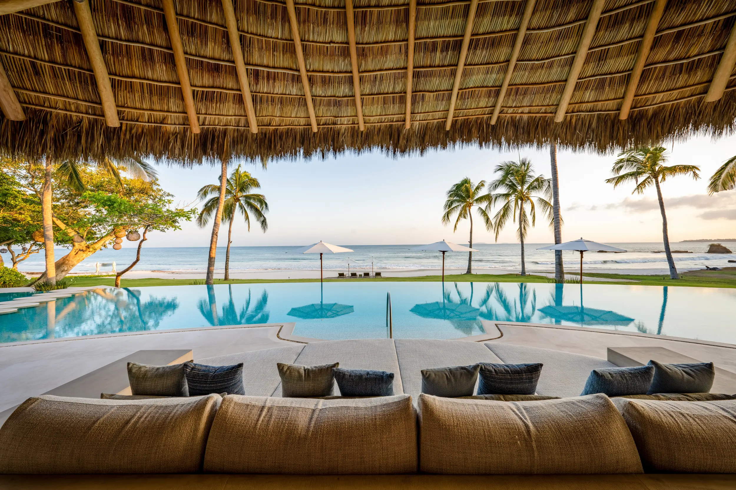 At the heart of the property, a massive heated infinity pool appears to spill directly into the ocean, flanked by an oversized hot tub that invites long, leisurely soaks under the sun or stars. Just beyond, direct access to one of Punta Mita’s finest swimmable white sand beaches places turquoise waters and soft surf mere steps from the villa, setting the stage for languid, sun-drenched days on the shore.