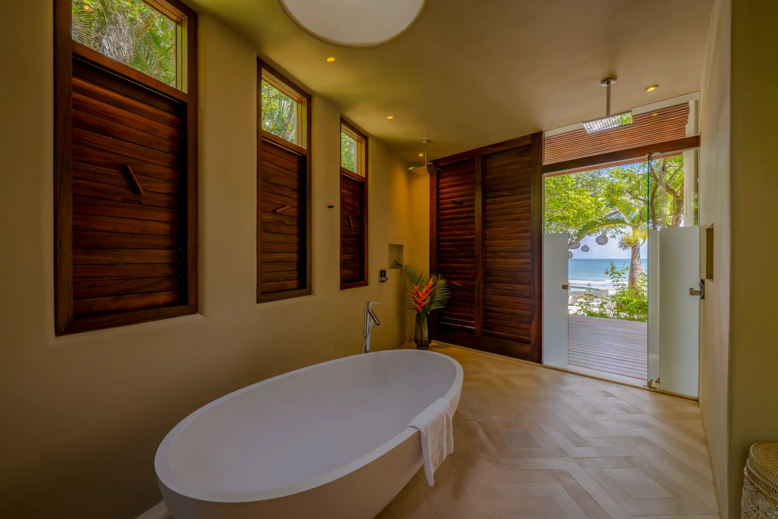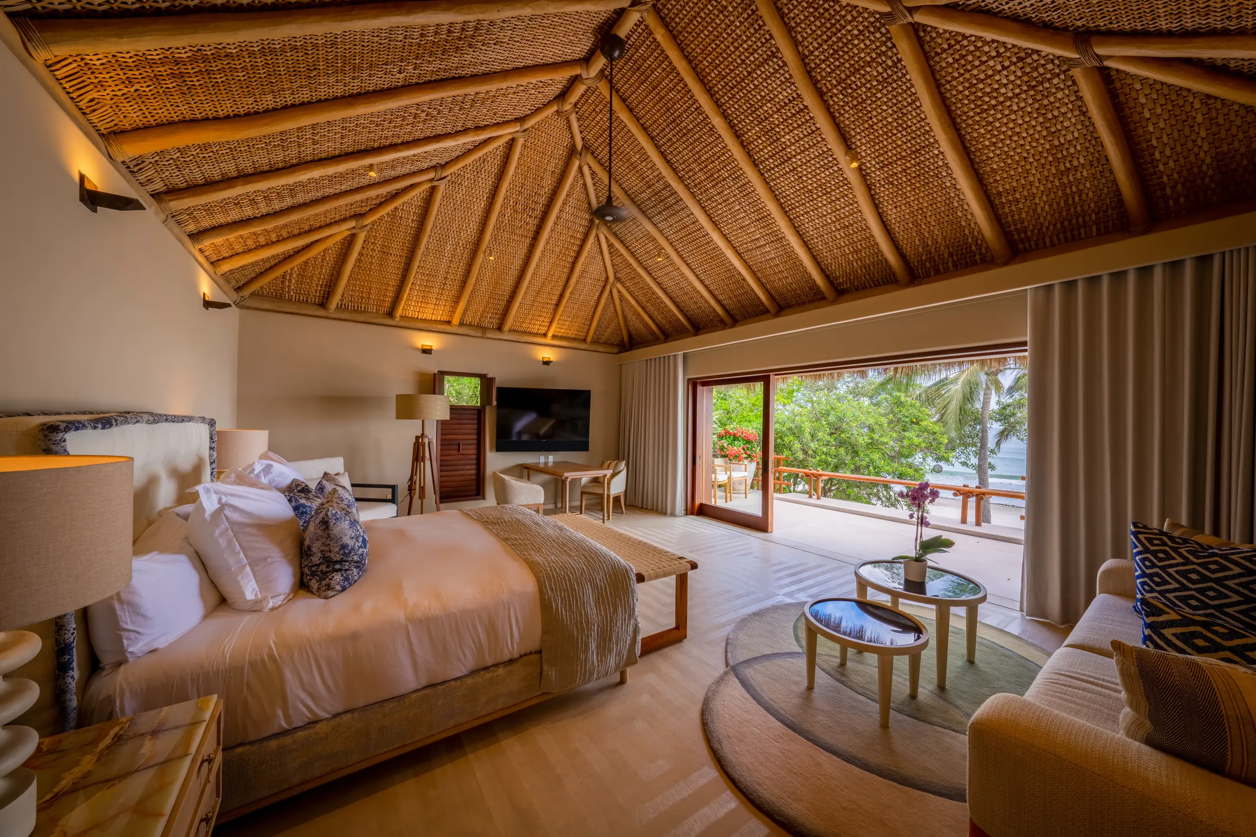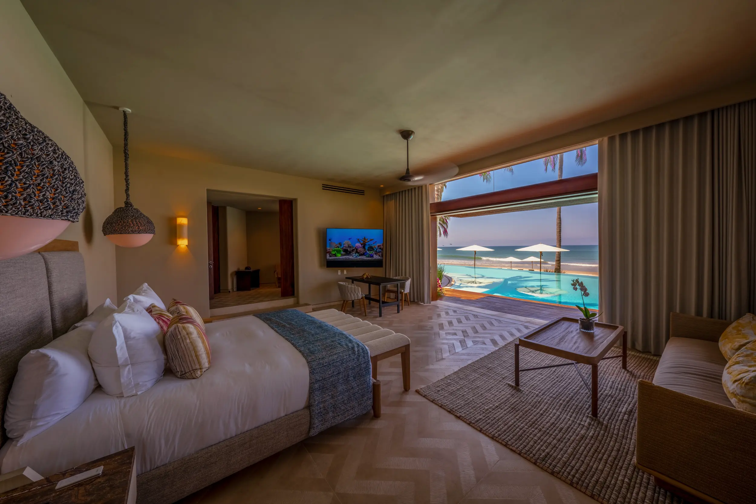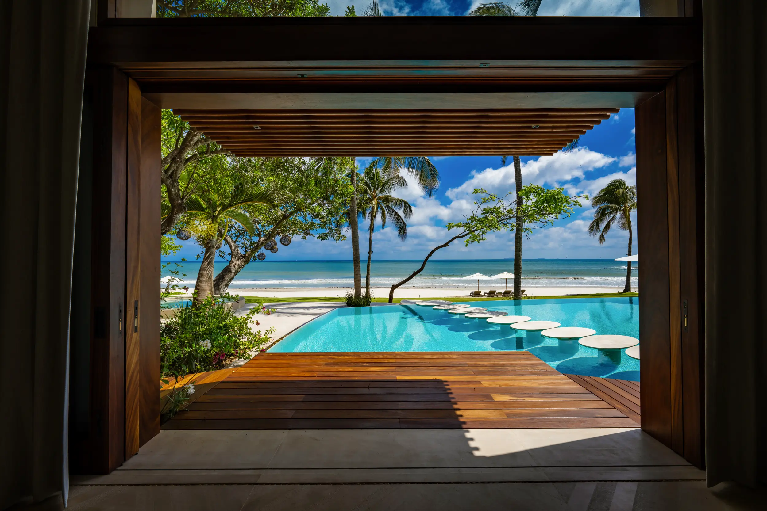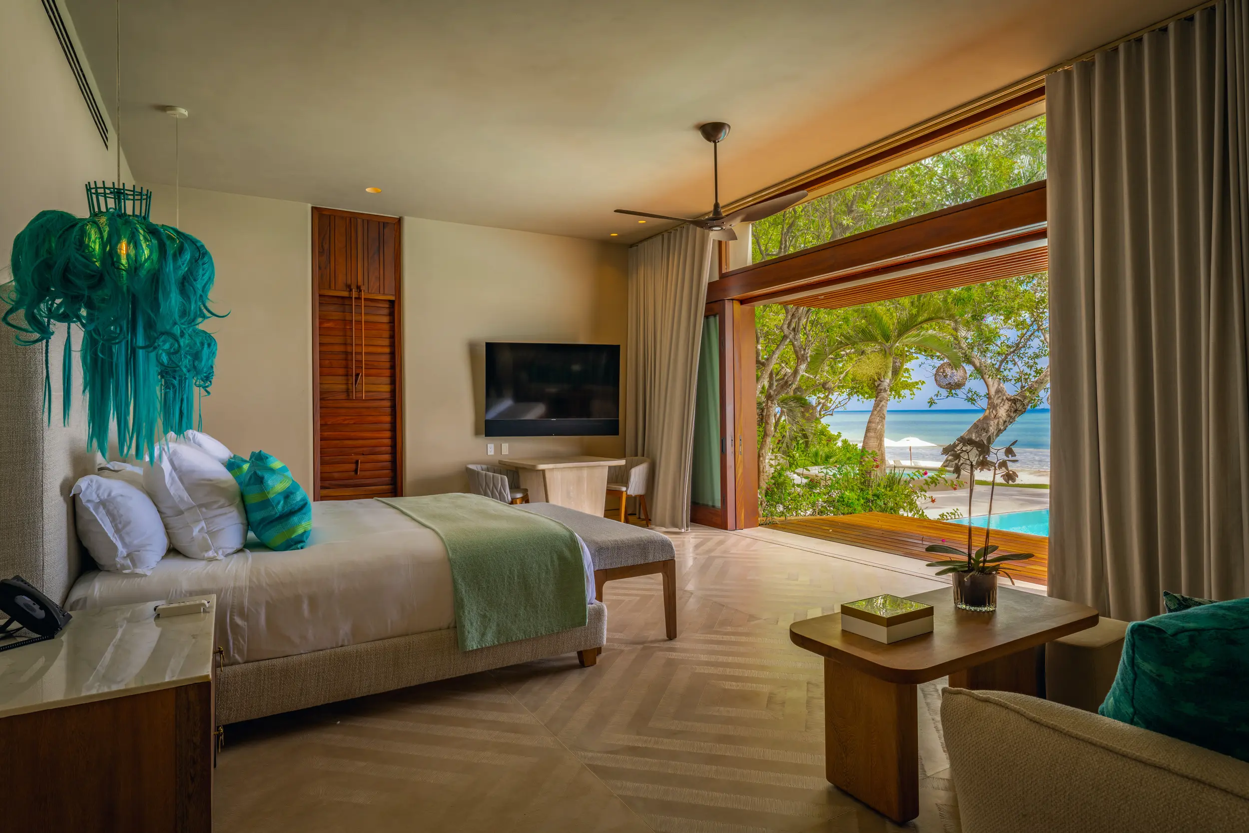 Casa Akama’s accommodations are designed for both togetherness and privacy. Four oceanfront master suites capture sweeping sea views, while five additional ensuite bedrooms provide generous space for family and friends. Each bedroom is equipped with smart electronics, ensuring comfort and convenience throughout the stay.