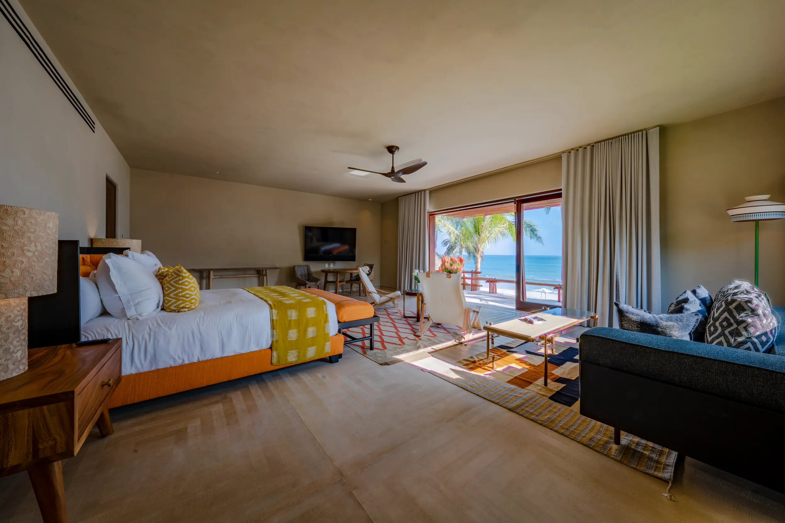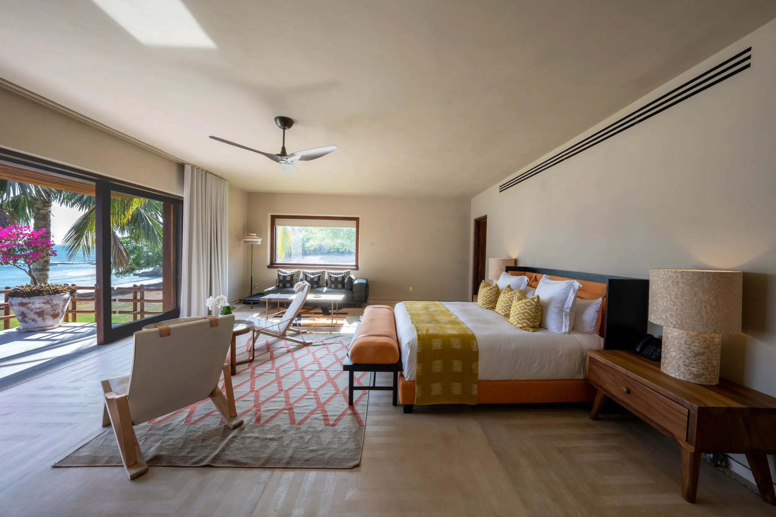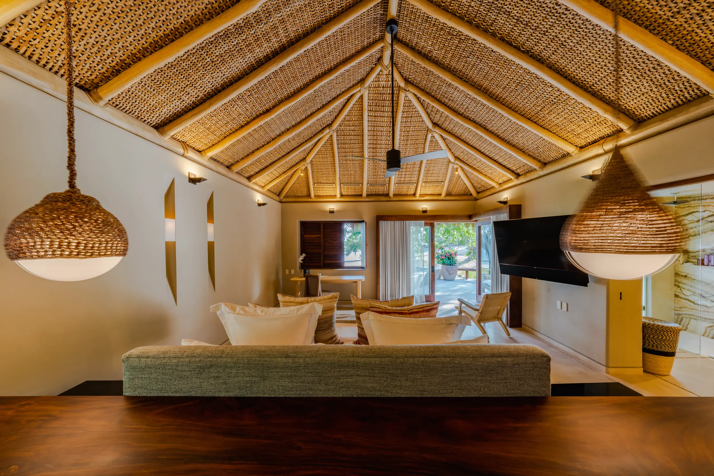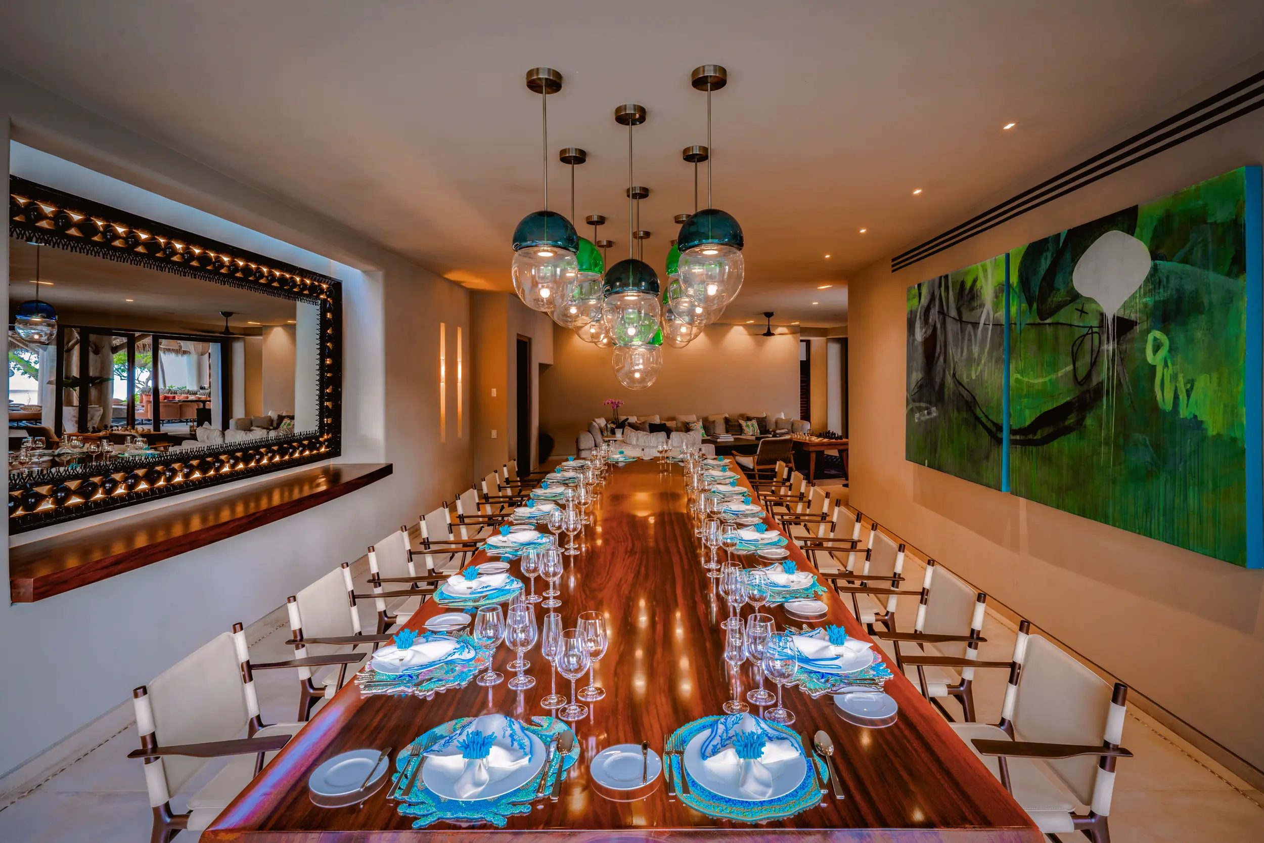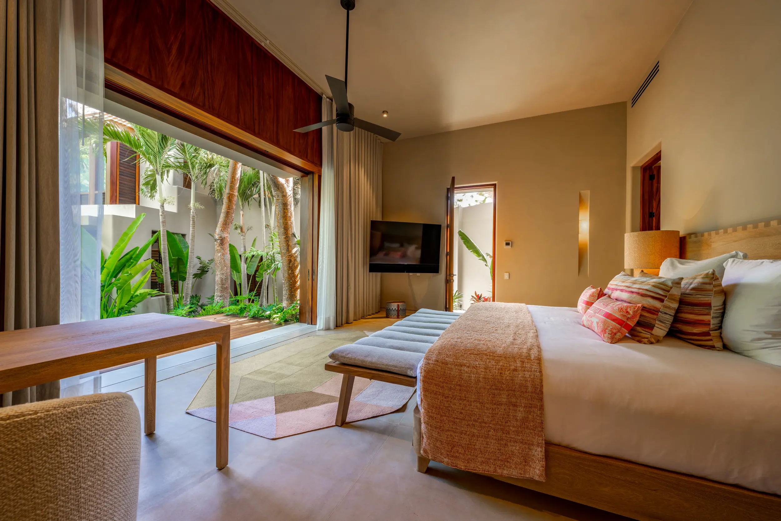Casa Akama’s accommodations are designed for both togetherness and privacy. Four oceanfront master suites capture sweeping sea views, while five additional ensuite bedrooms provide generous space for family and friends. Each bedroom is equipped with smart electronics, ensuring comfort and convenience throughout the stay.