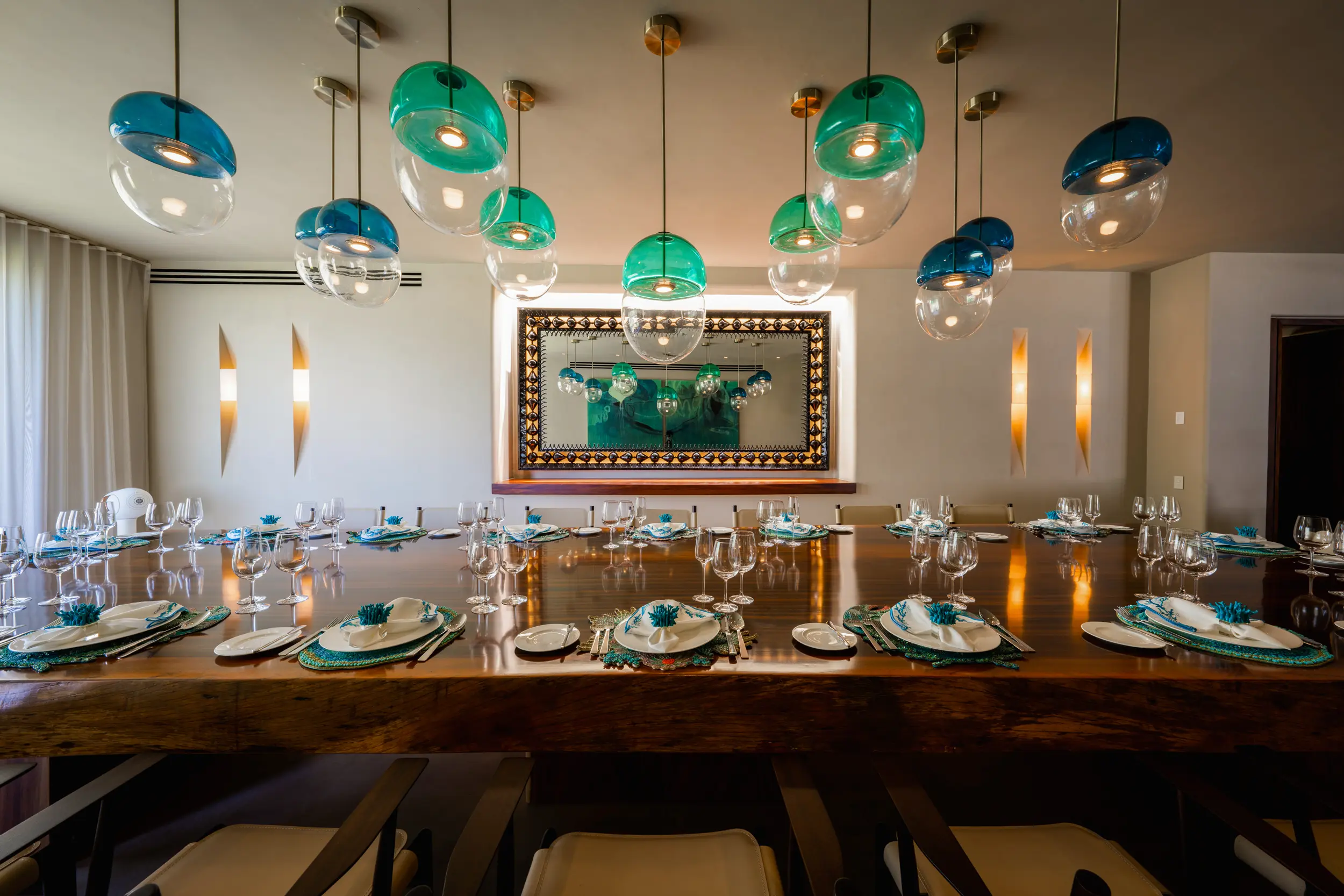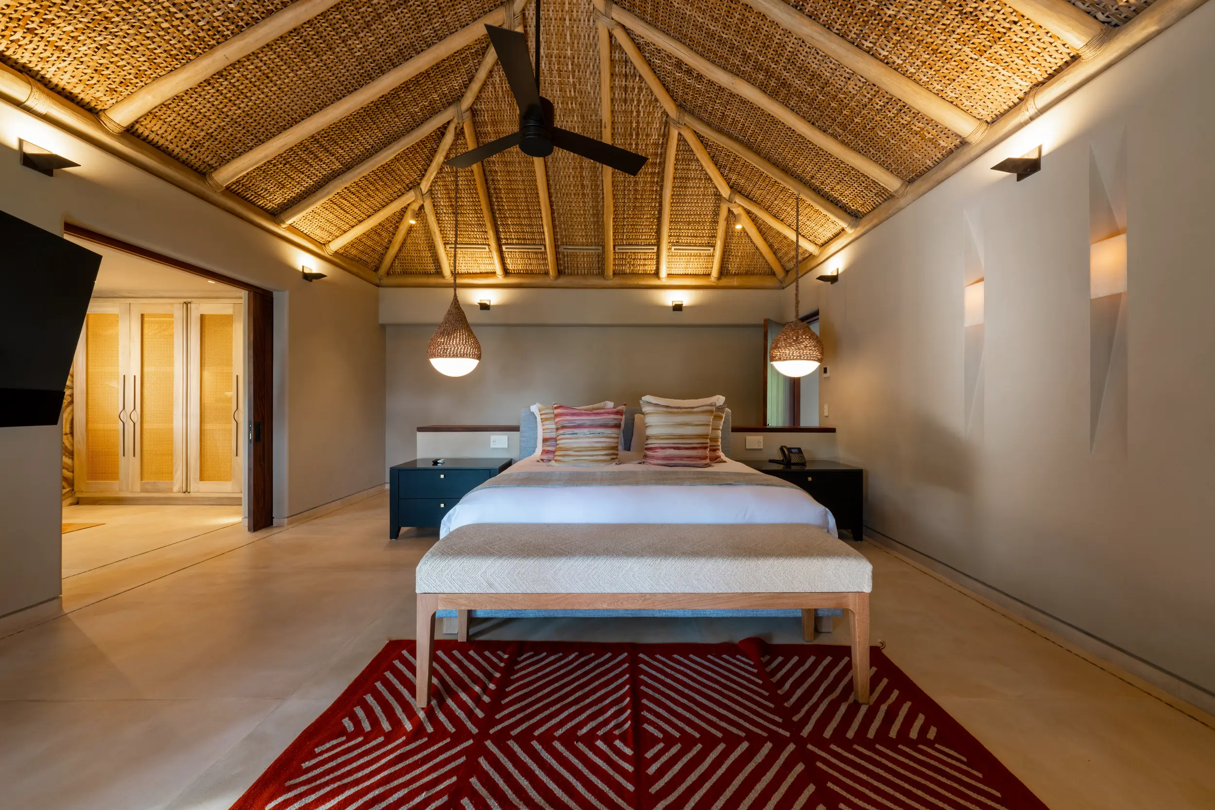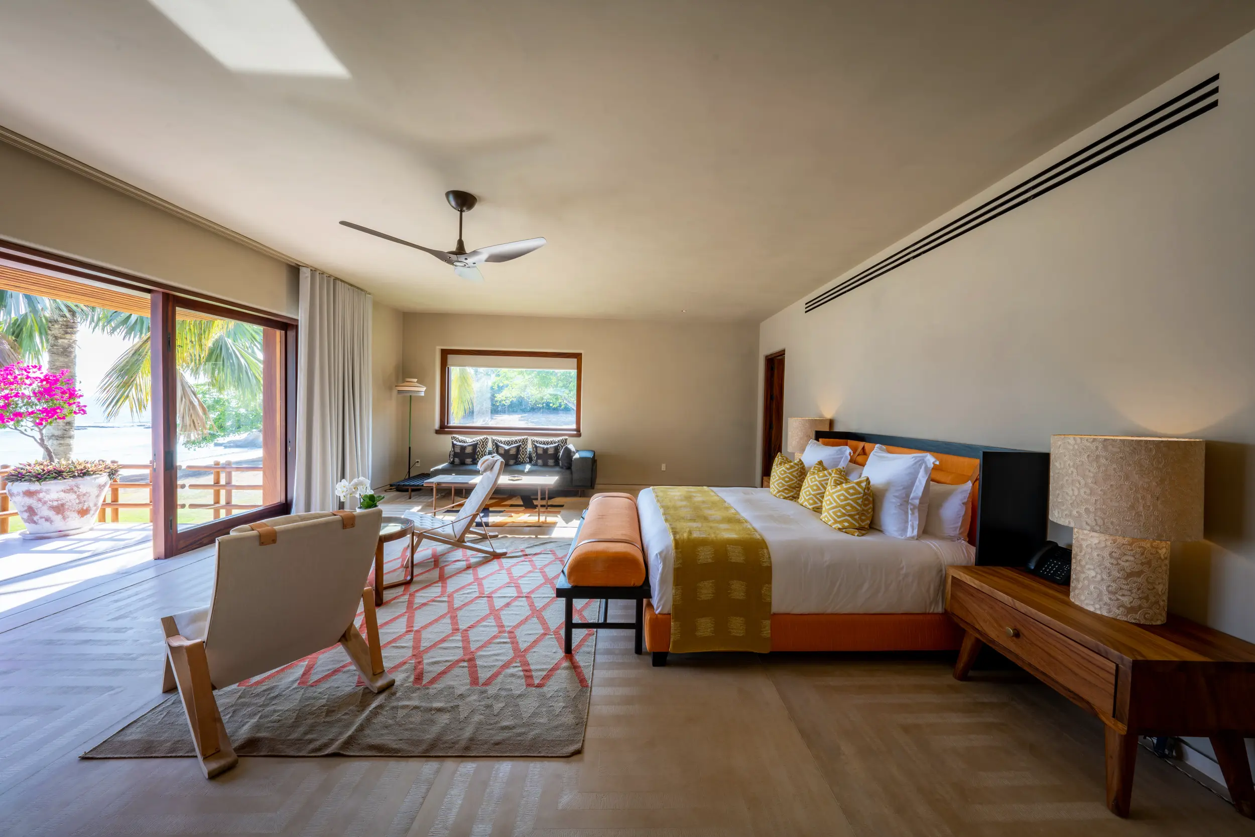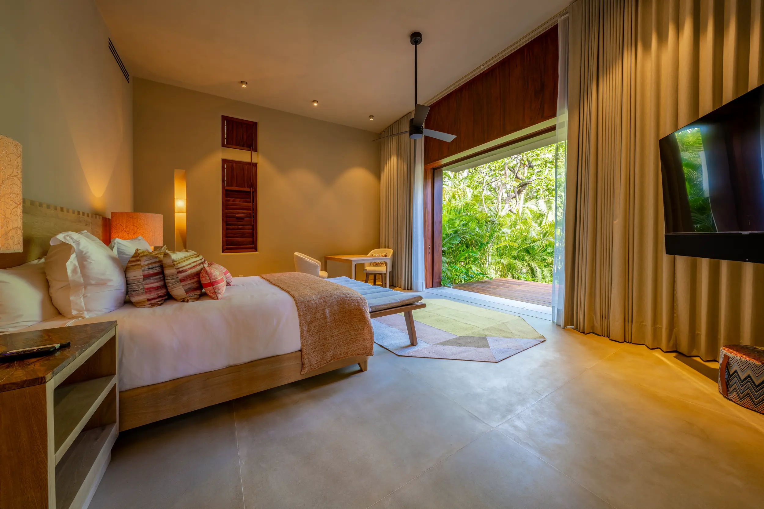 Casa Akama’s accommodations are designed for both togetherness and privacy. Four oceanfront master suites capture sweeping sea views, while five additional ensuite bedrooms provide generous space for family and friends. Each bedroom is equipped with smart electronics, ensuring comfort and convenience throughout the stay.