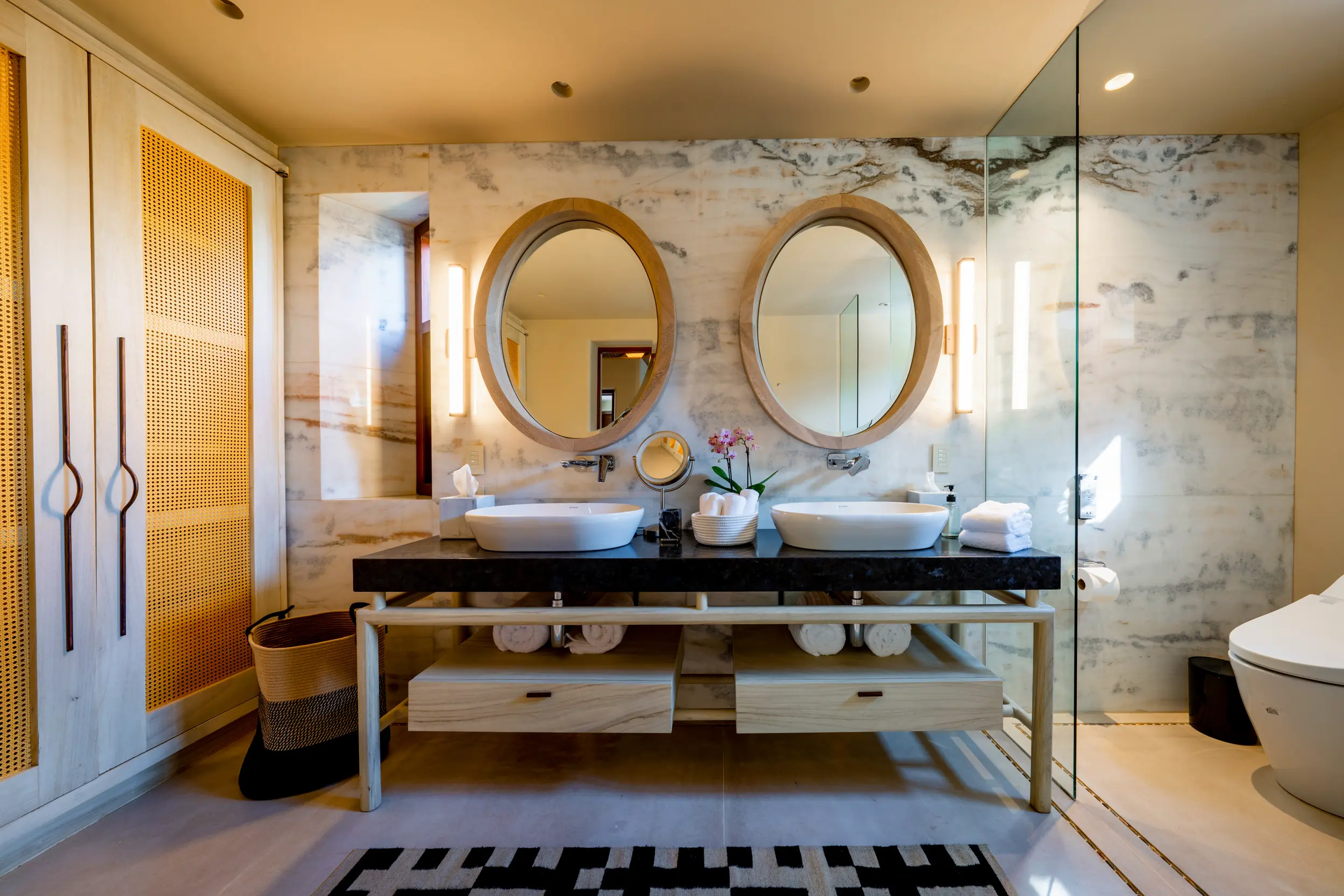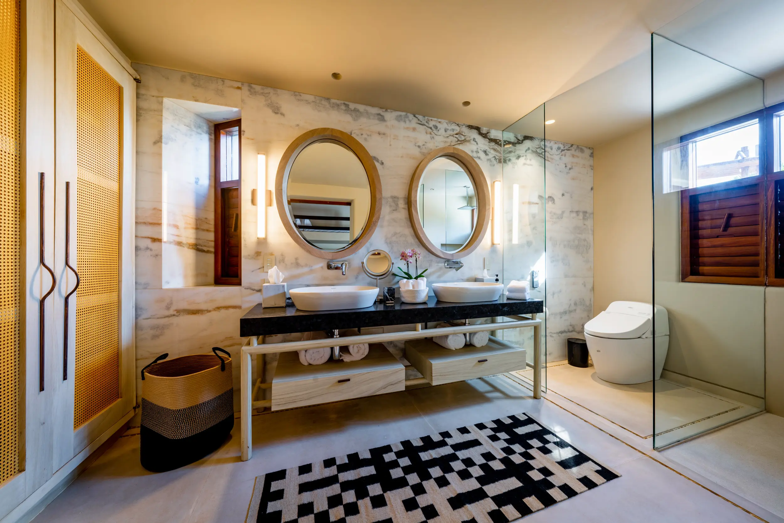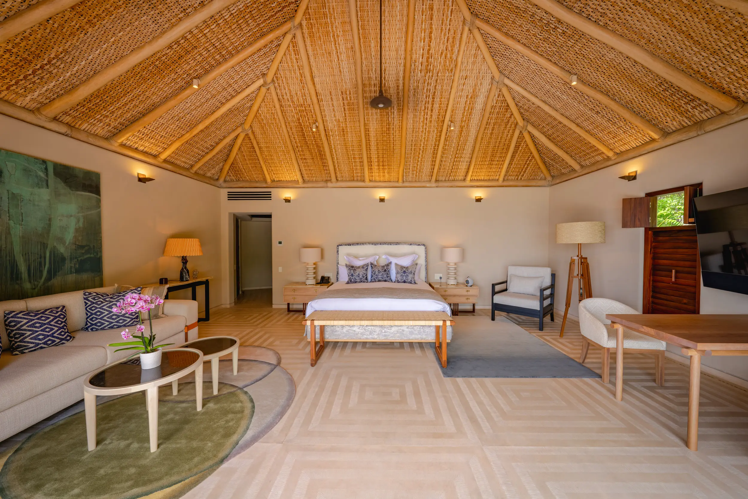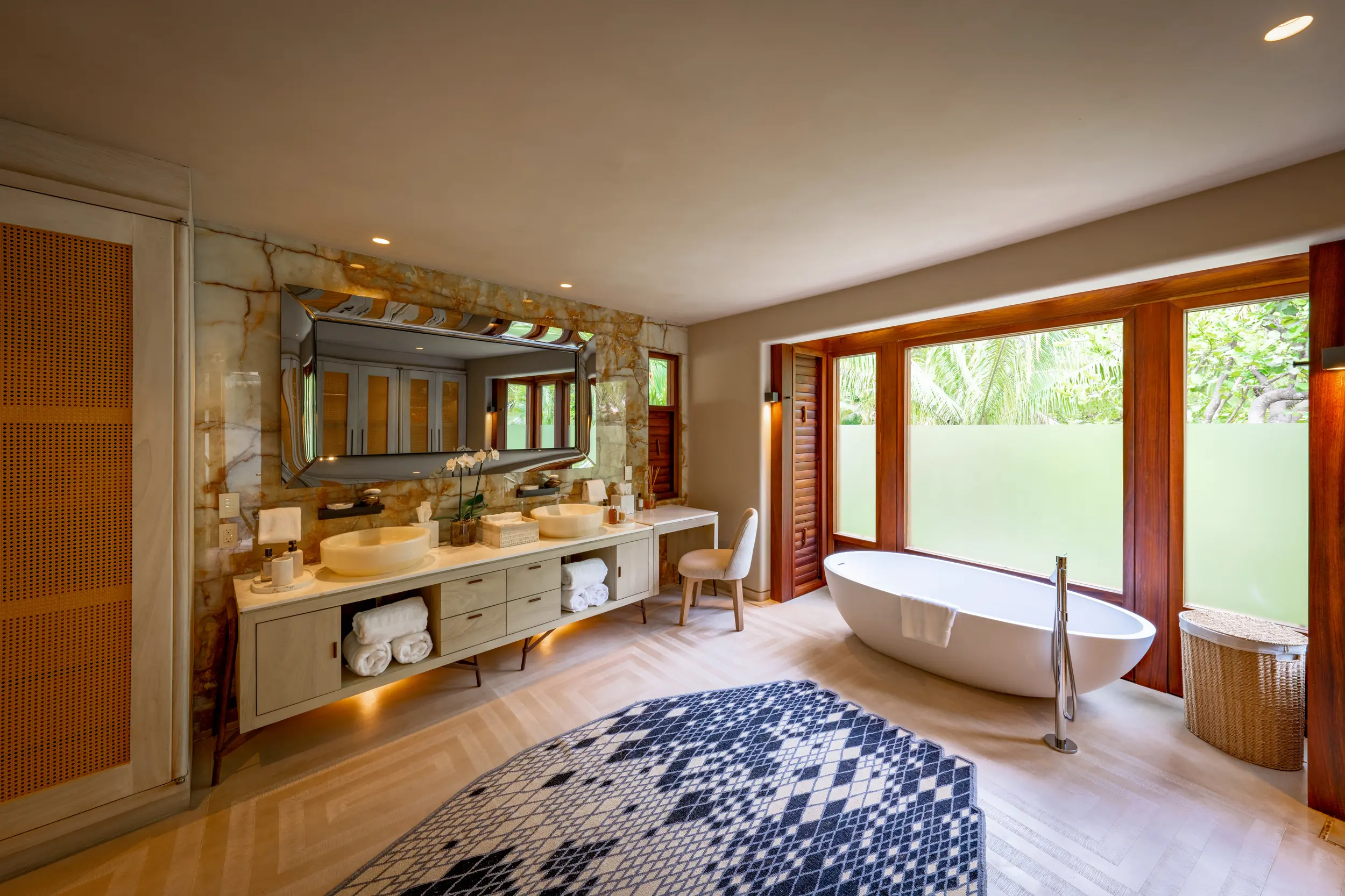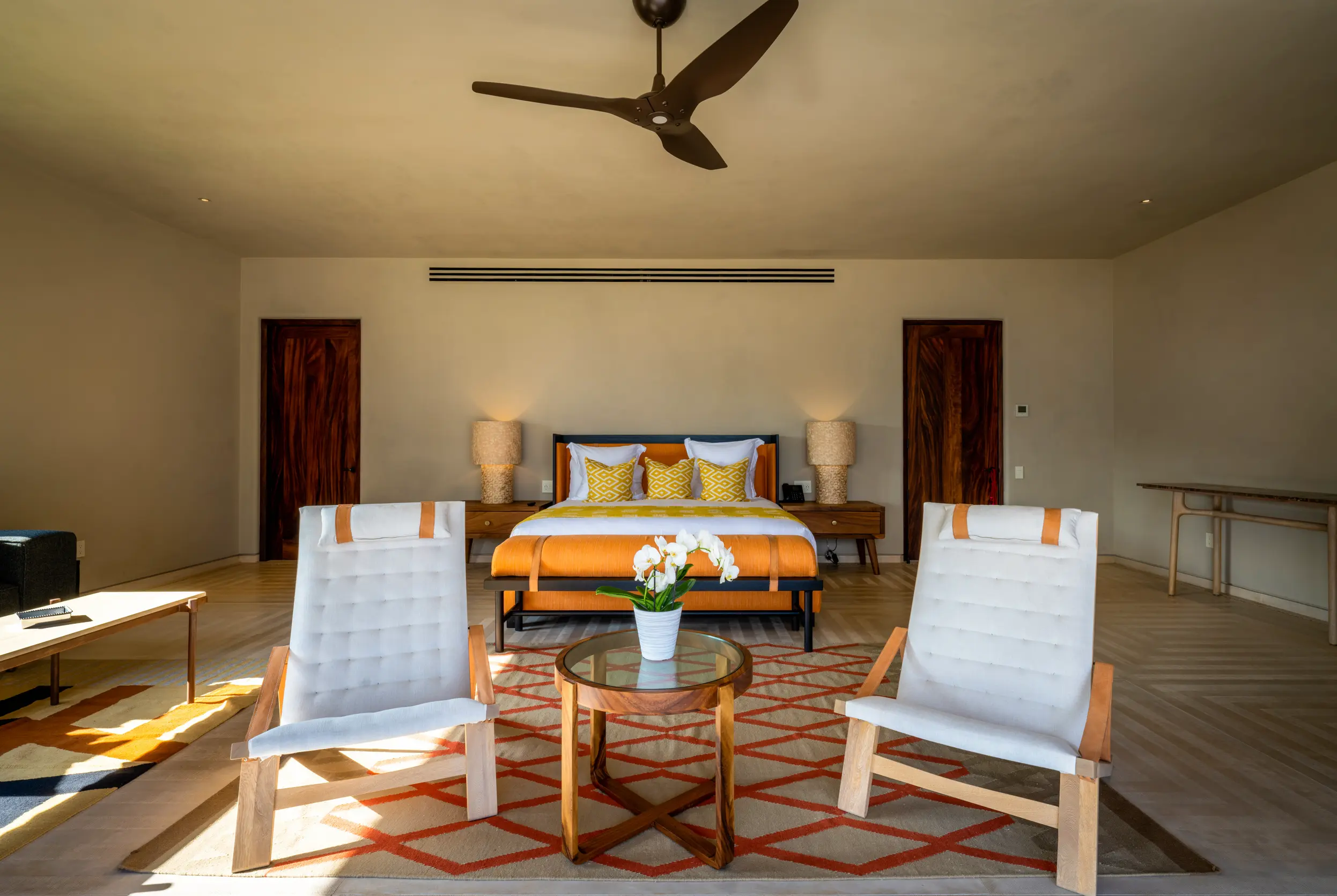 Casa Akama’s accommodations are designed for both togetherness and privacy. Four oceanfront master suites capture sweeping sea views, while five additional ensuite bedrooms provide generous space for family and friends. Each bedroom is equipped with smart electronics, ensuring comfort and convenience throughout the stay.