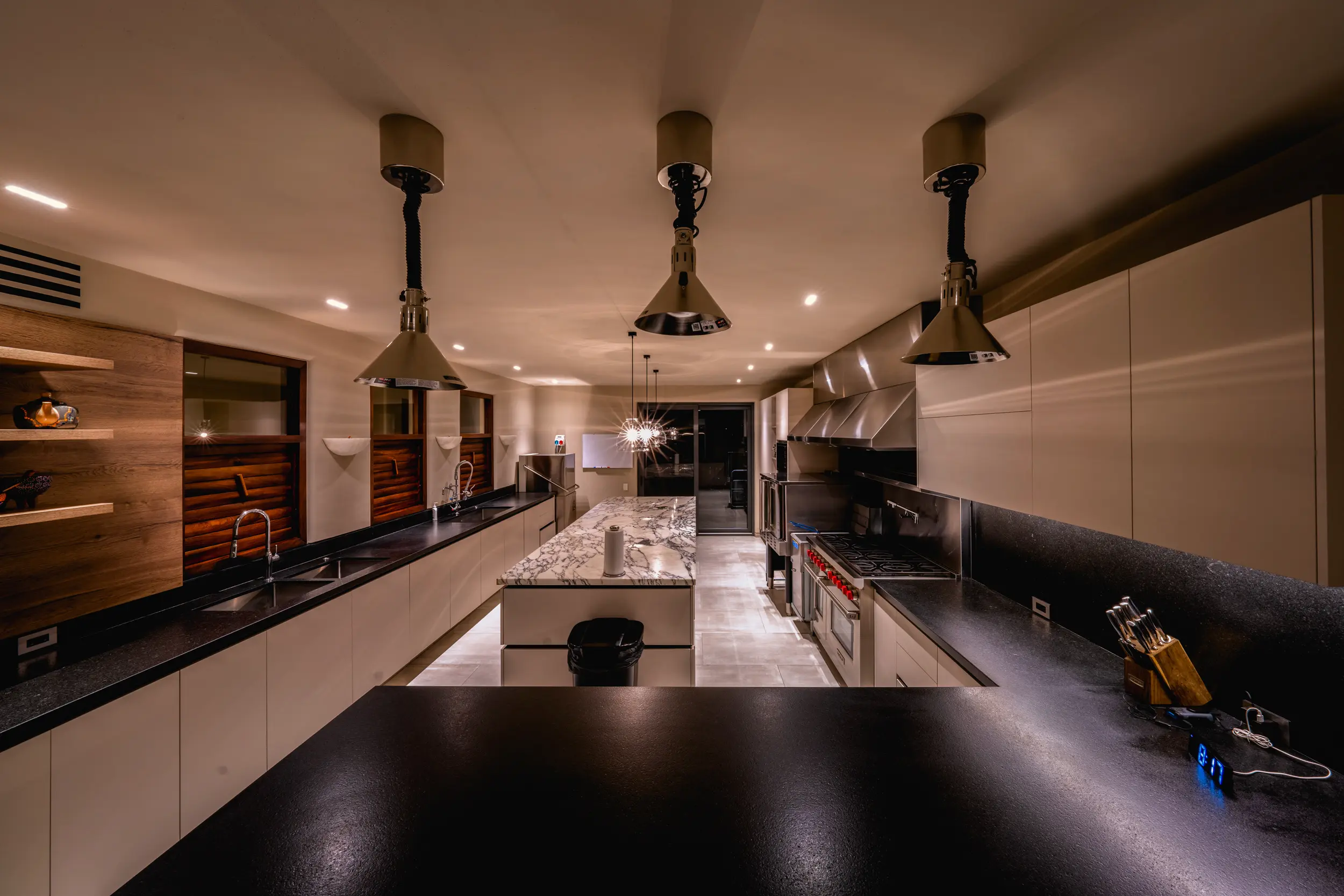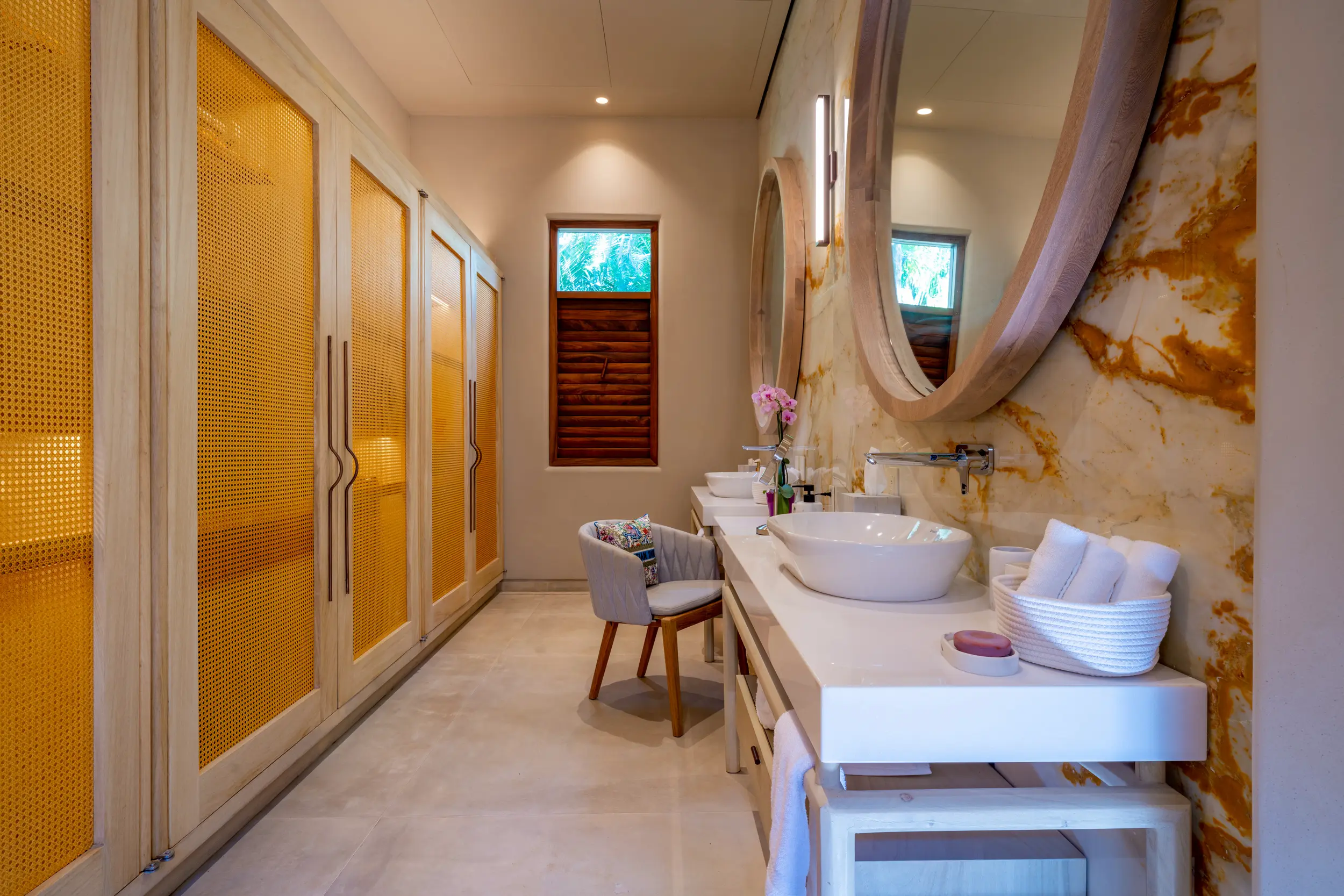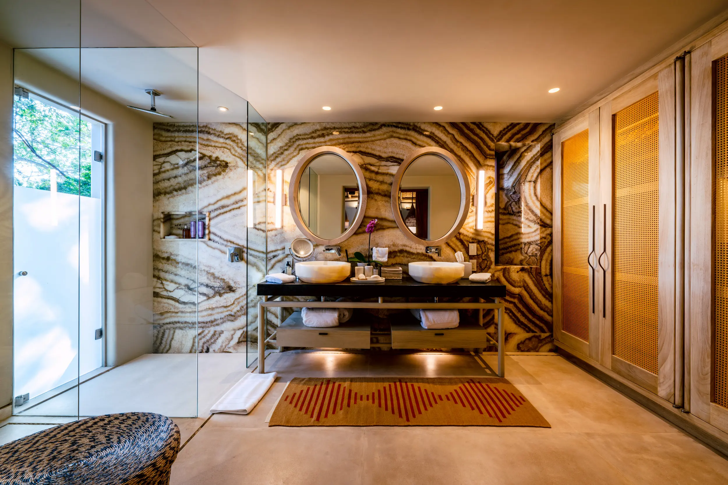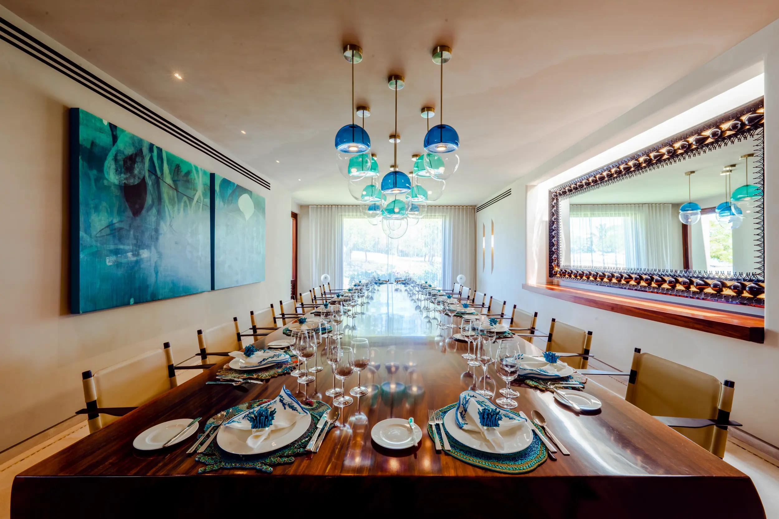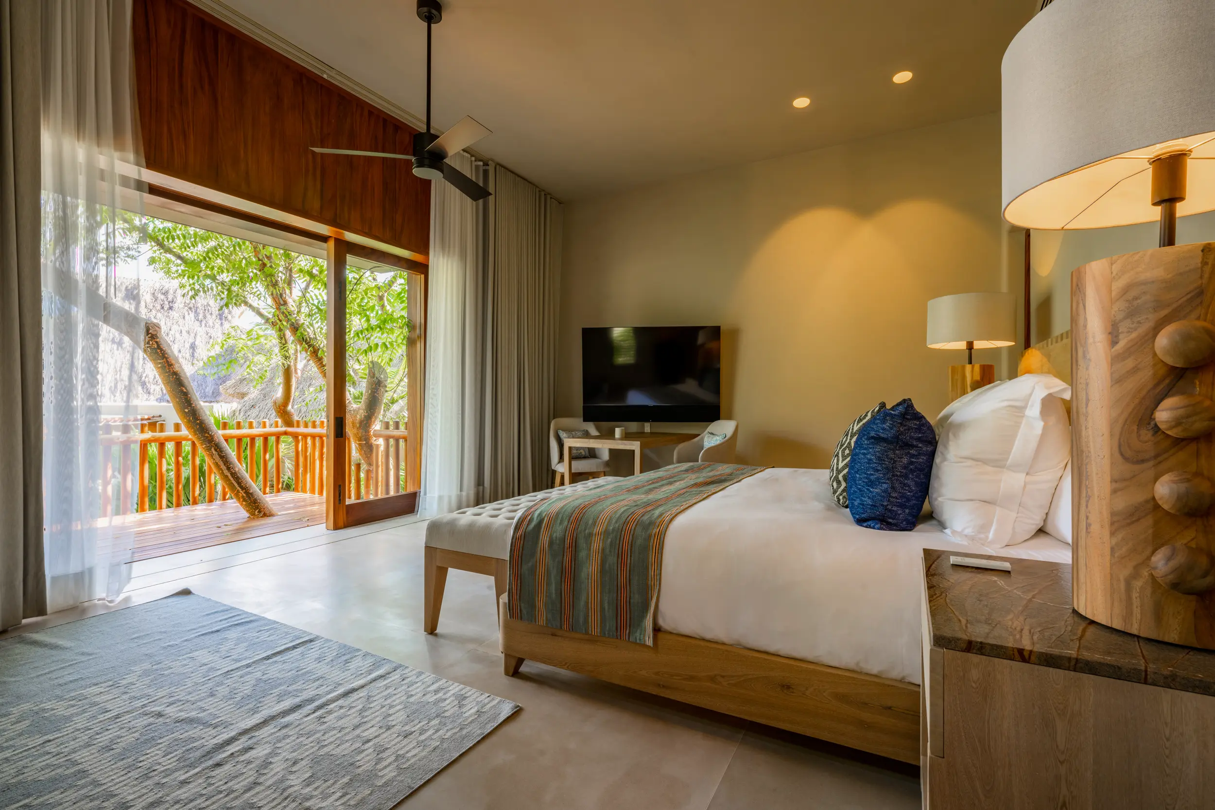 Casa Akama’s accommodations are designed for both togetherness and privacy. Four oceanfront master suites capture sweeping sea views, while five additional ensuite bedrooms provide generous space for family and friends. Each bedroom is equipped with smart electronics, ensuring comfort and convenience throughout the stay.