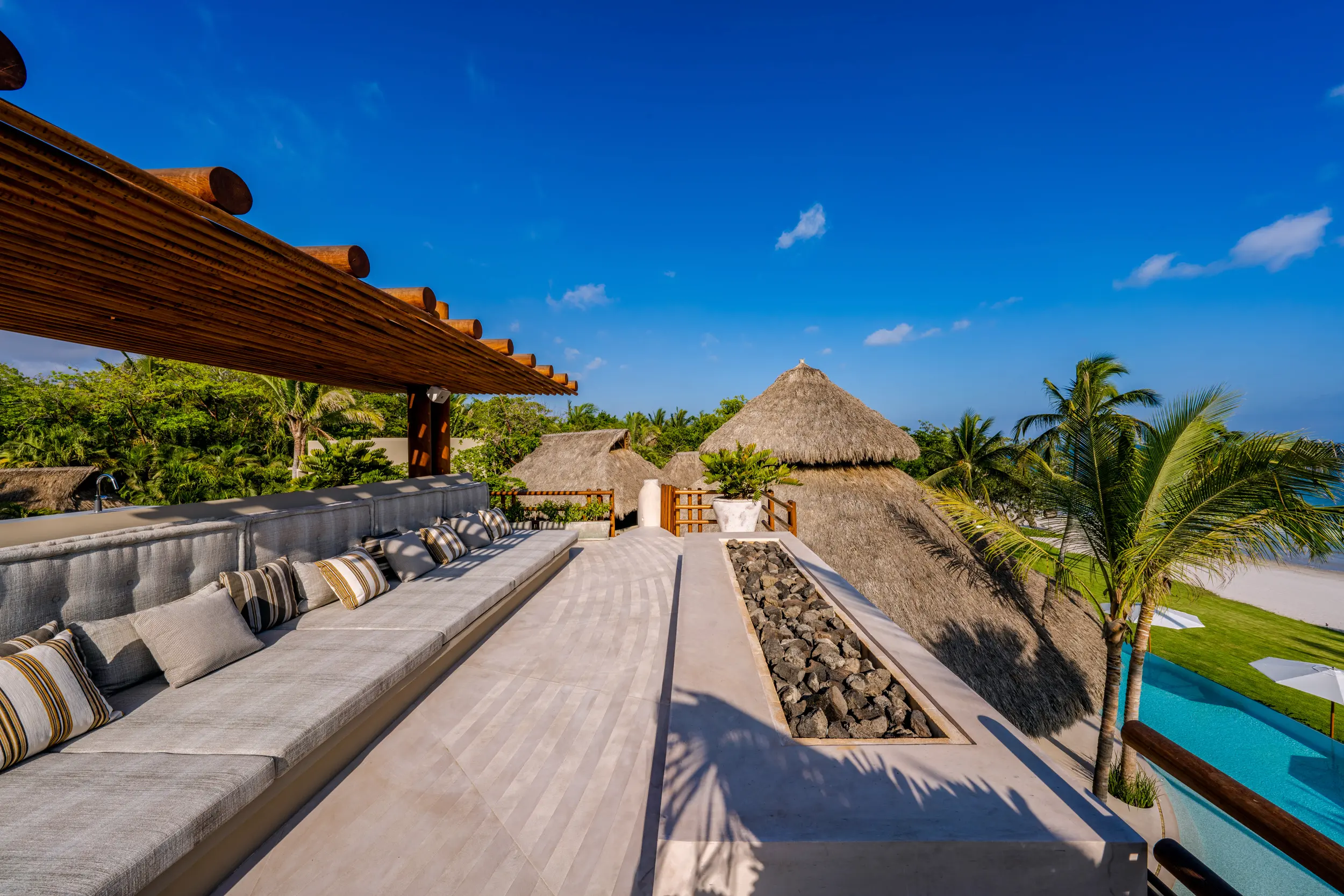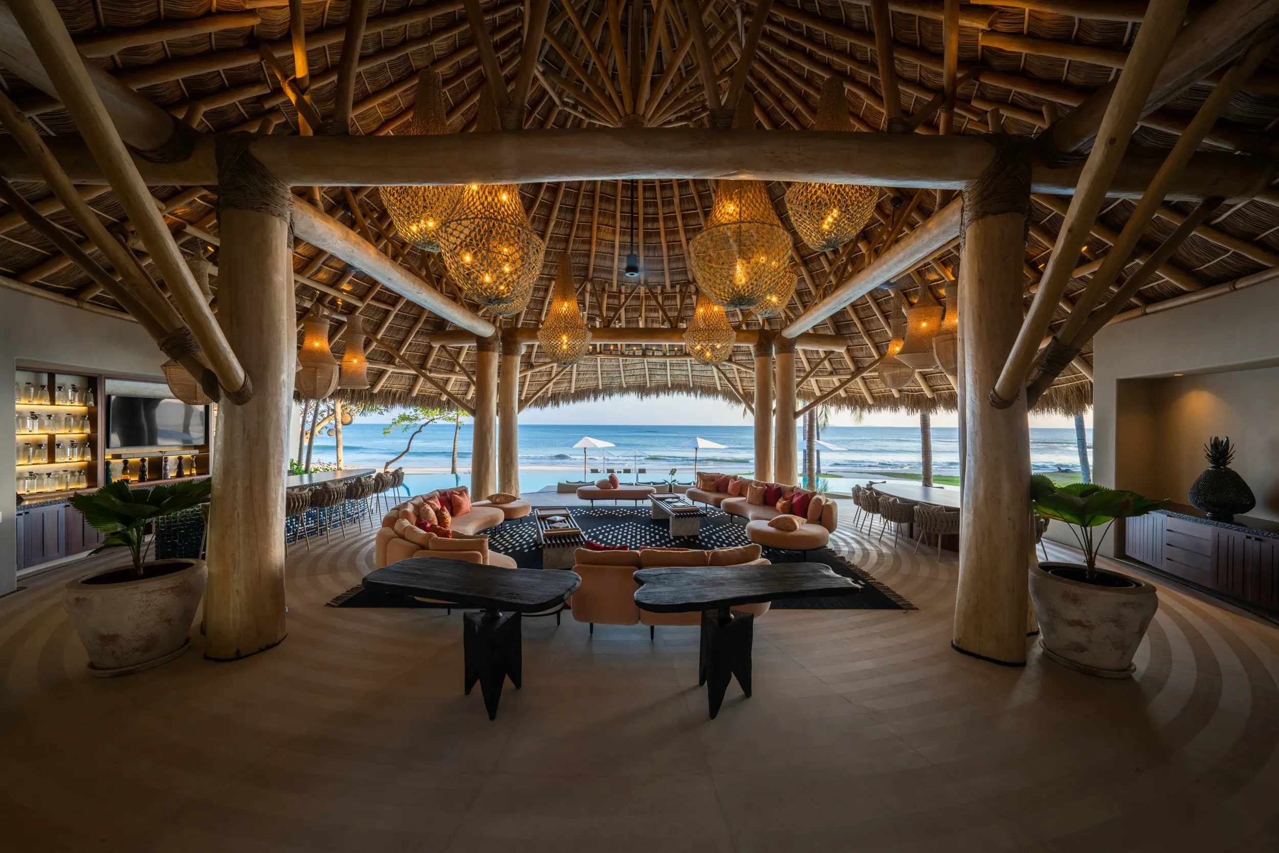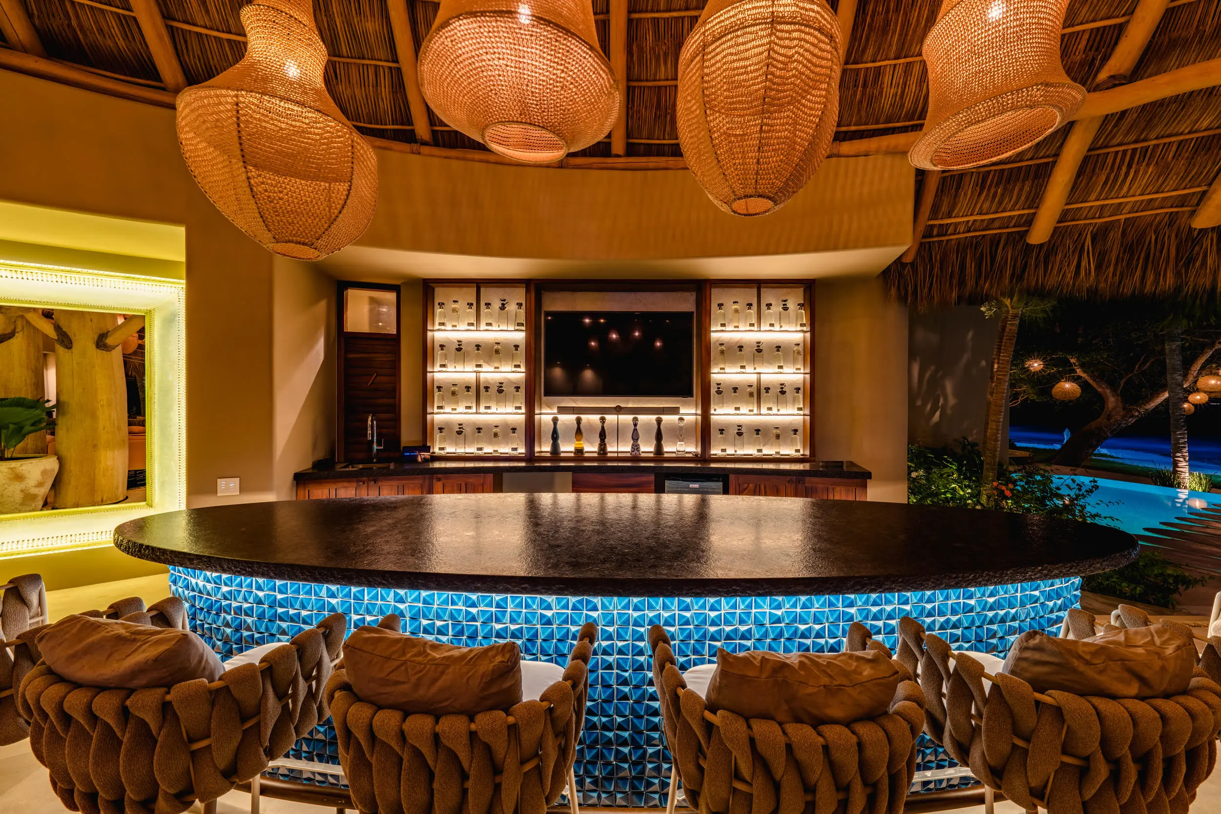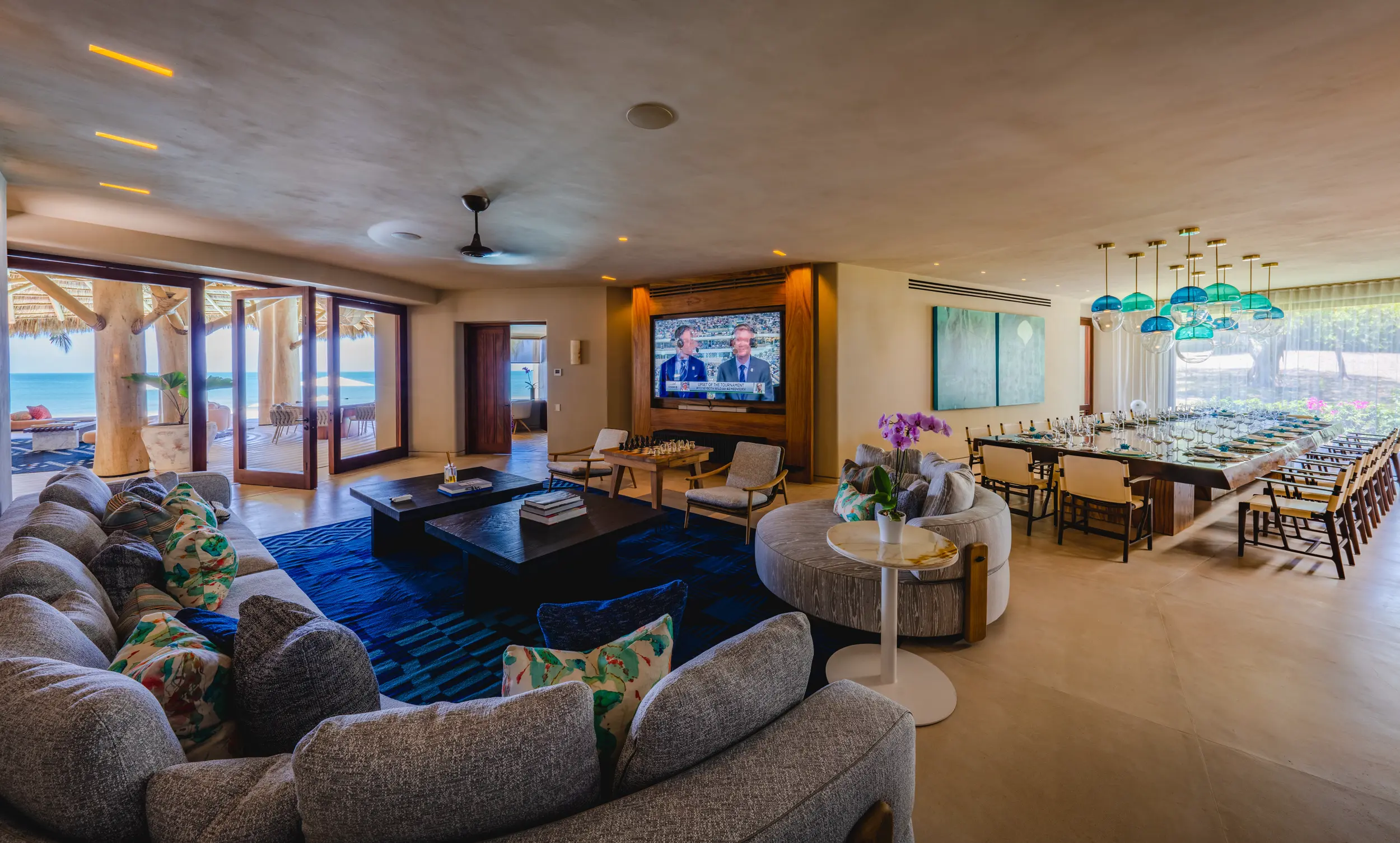The villa’s amenities are curated for high-end travelers who expect the exceptional. Mexico’s only commercial-grade Dolby Atmos private cinema transforms movie nights into a fully immersive experience, with state-of-the-art surround sound that rivals top-tier theaters. A grand alfresco palapa serves as the social heart of the home, offering a dramatic open-air setting for dining and entertaining against the backdrop of the ocean.