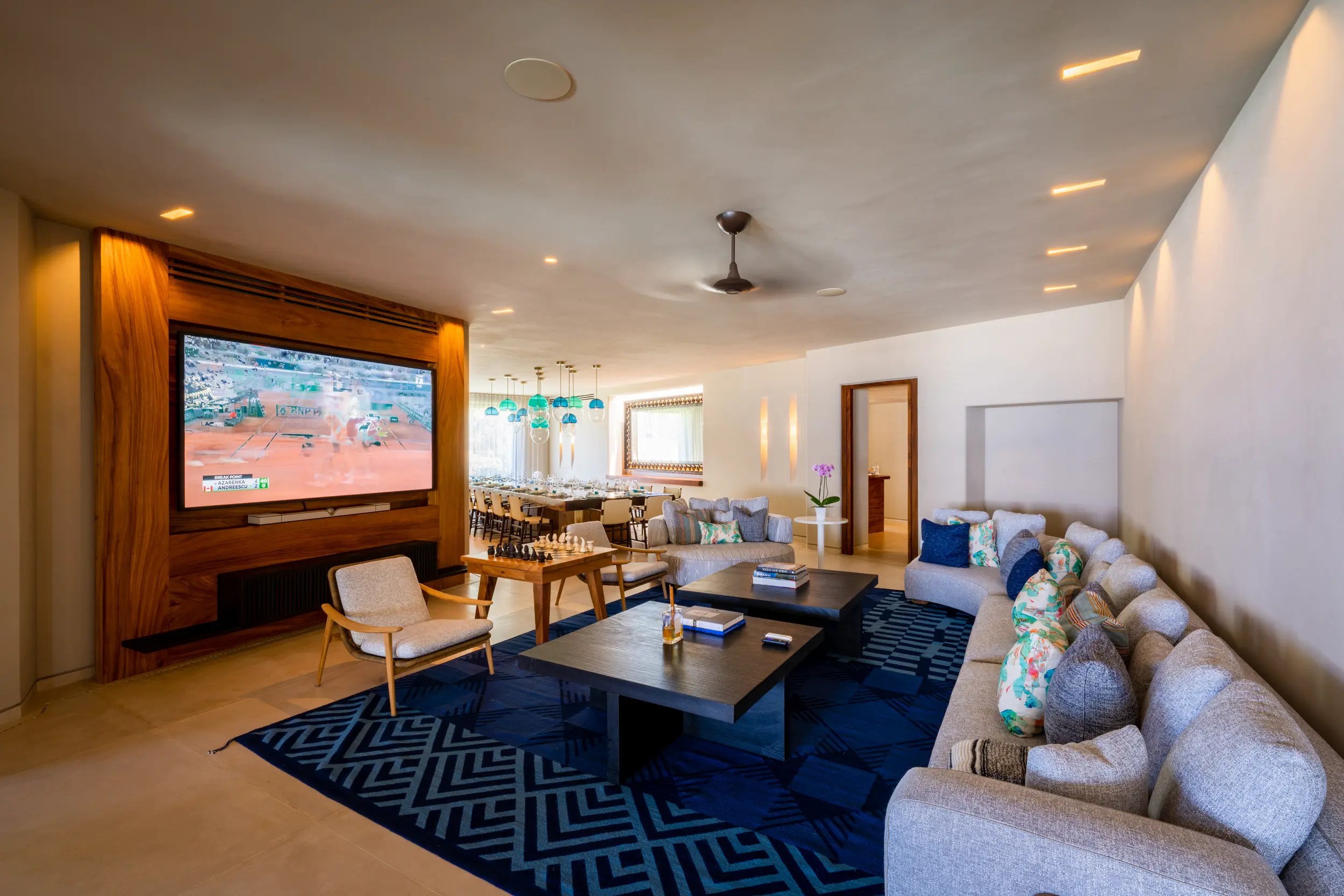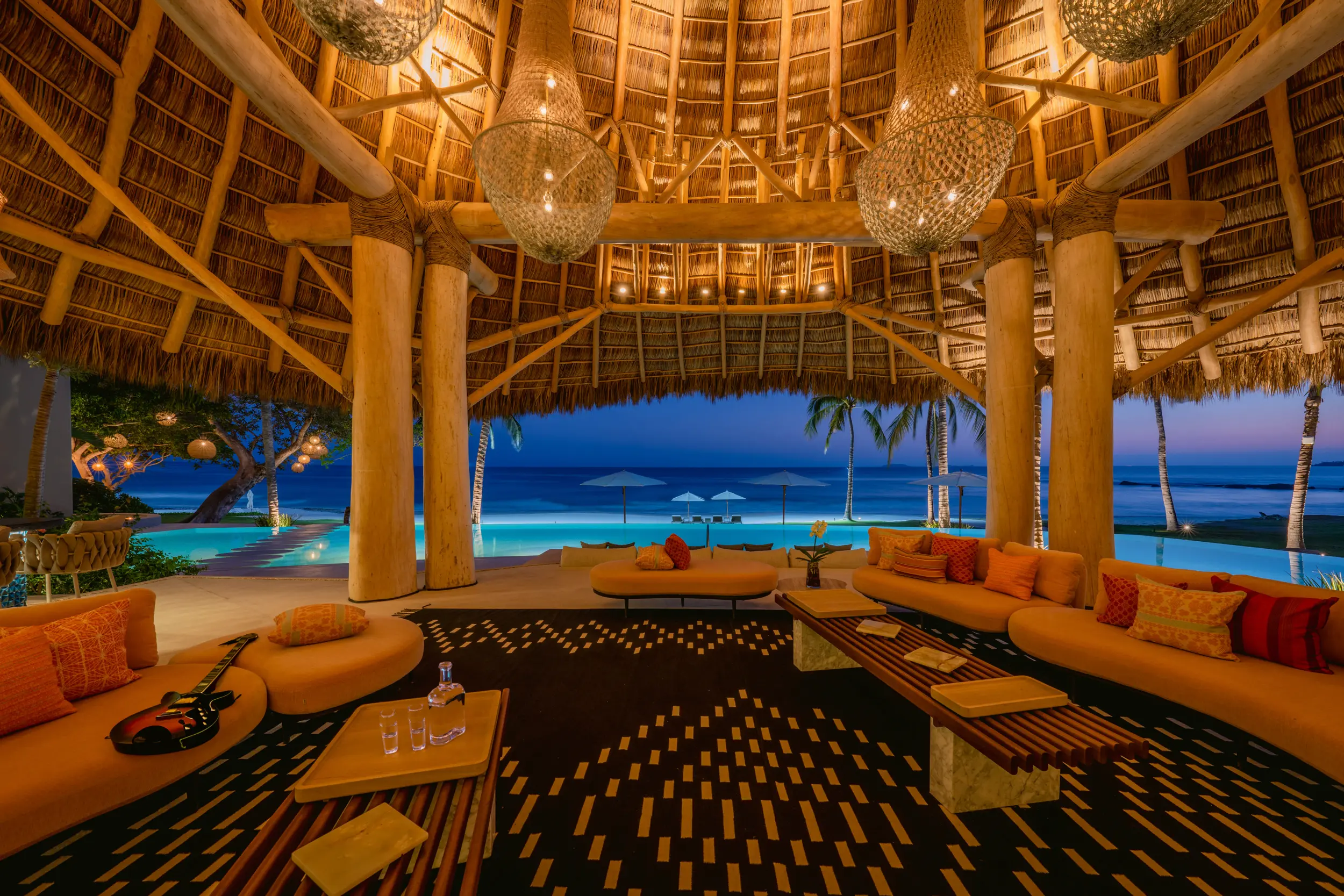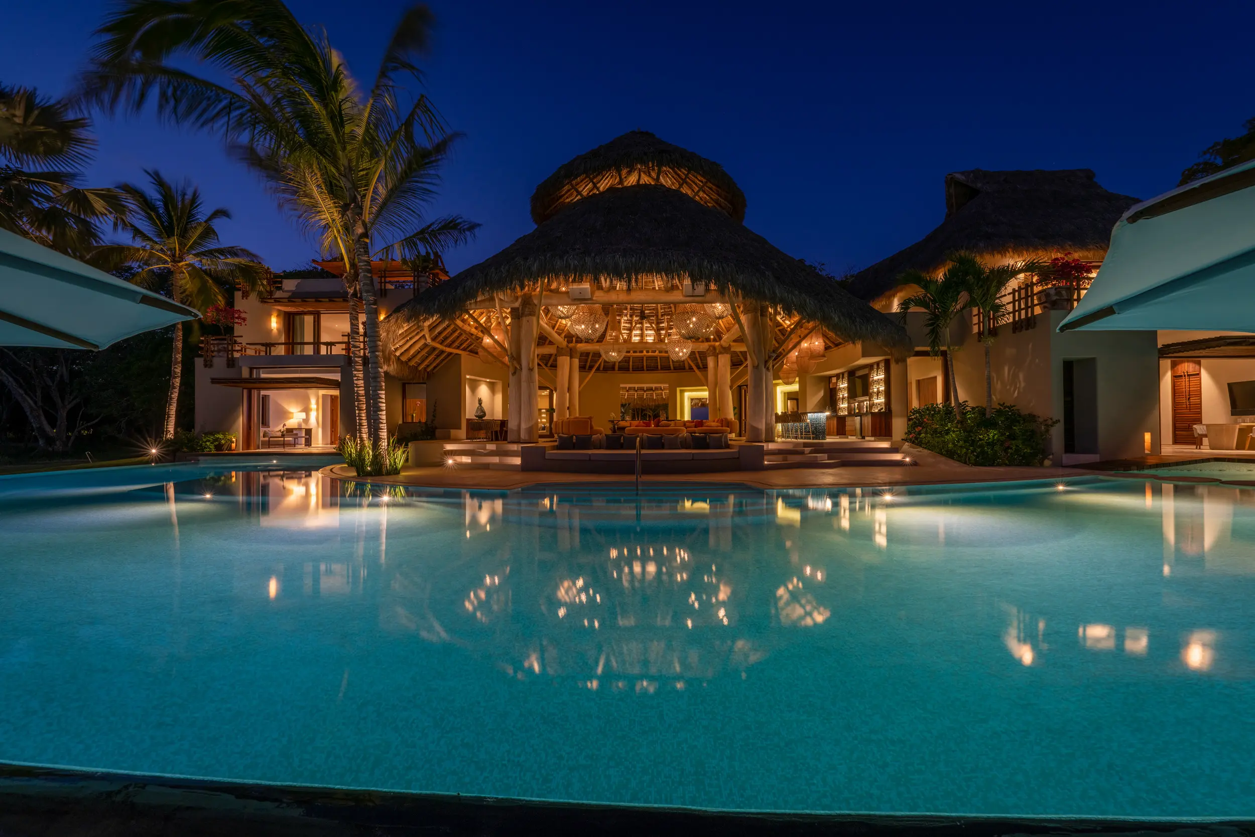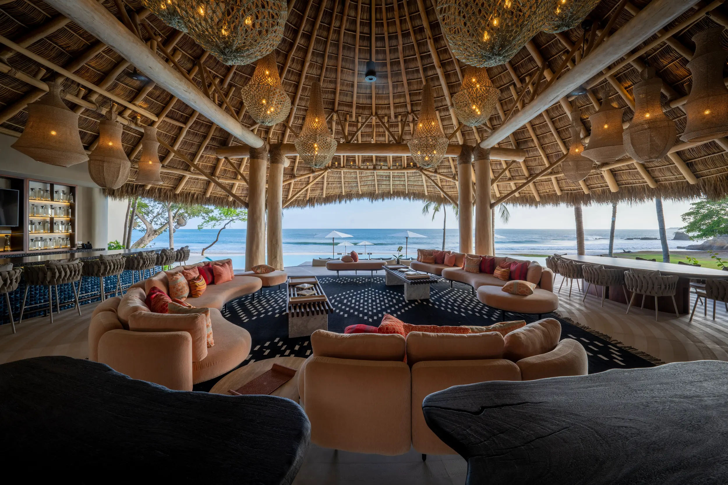 The villa’s amenities are curated for high-end travelers who expect the exceptional. Mexico’s only commercial-grade Dolby Atmos private cinema transforms movie nights into a fully immersive experience, with state-of-the-art surround sound that rivals top-tier theaters. A grand alfresco palapa serves as the social heart of the home, offering a dramatic open-air setting for dining and entertaining against the backdrop of the ocean.