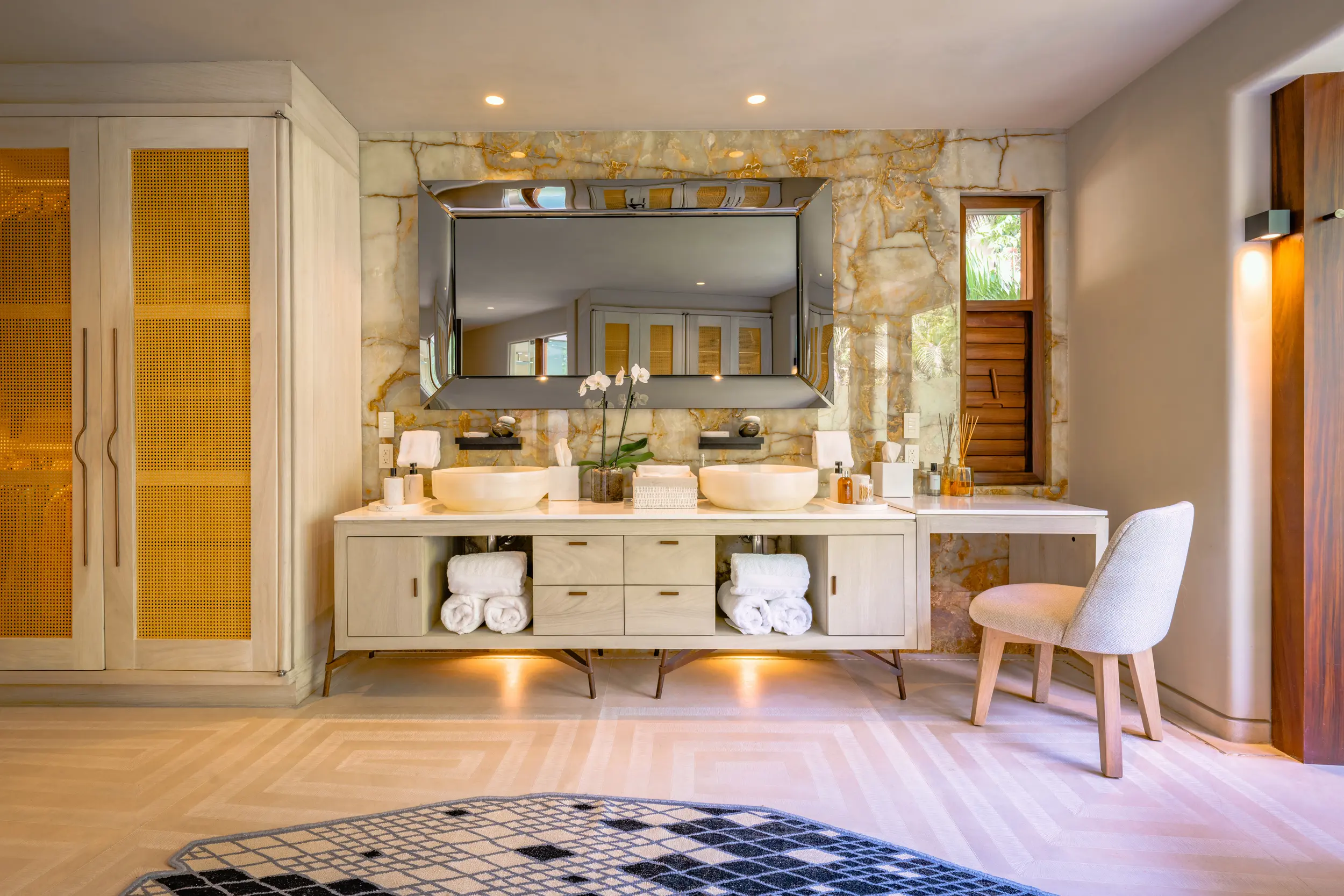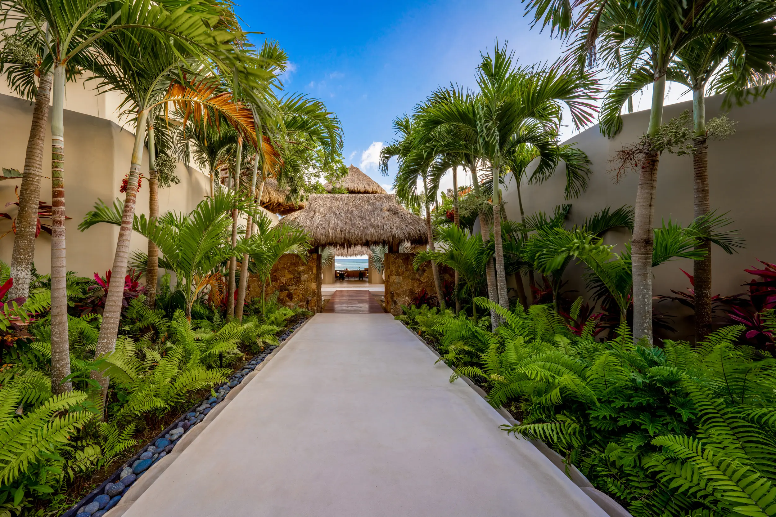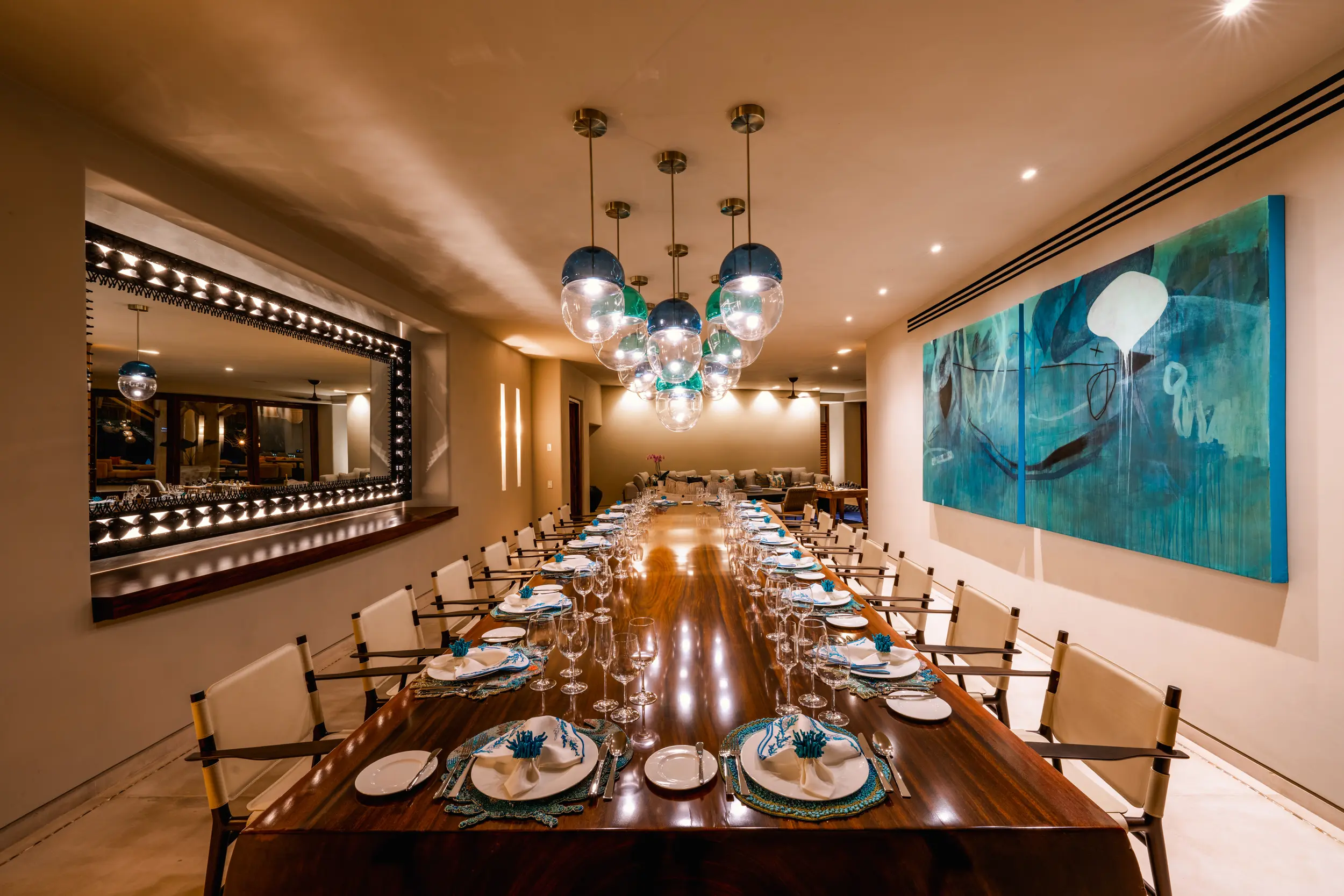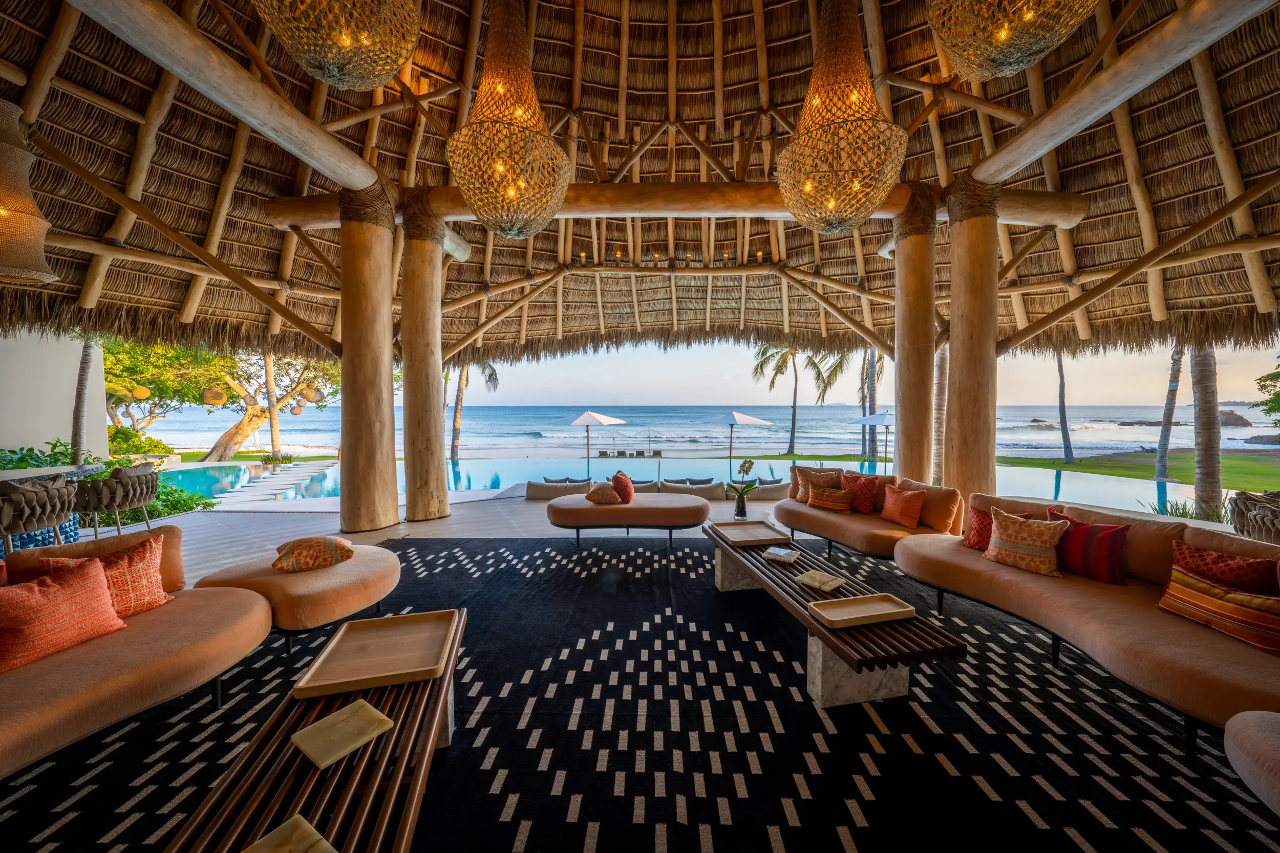 The villa’s amenities are curated for high-end travelers who expect the exceptional. Mexico’s only commercial-grade Dolby Atmos private cinema transforms movie nights into a fully immersive experience, with state-of-the-art surround sound that rivals top-tier theaters. A grand alfresco palapa serves as the social heart of the home, offering a dramatic open-air setting for dining and entertaining against the backdrop of the ocean.