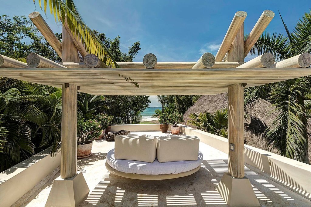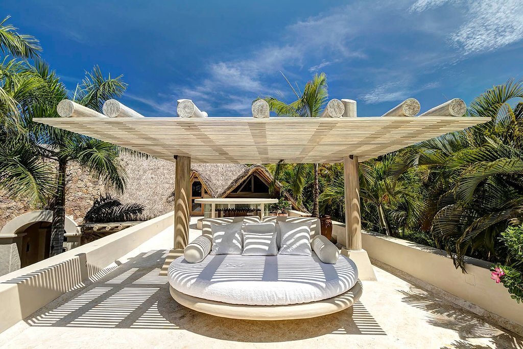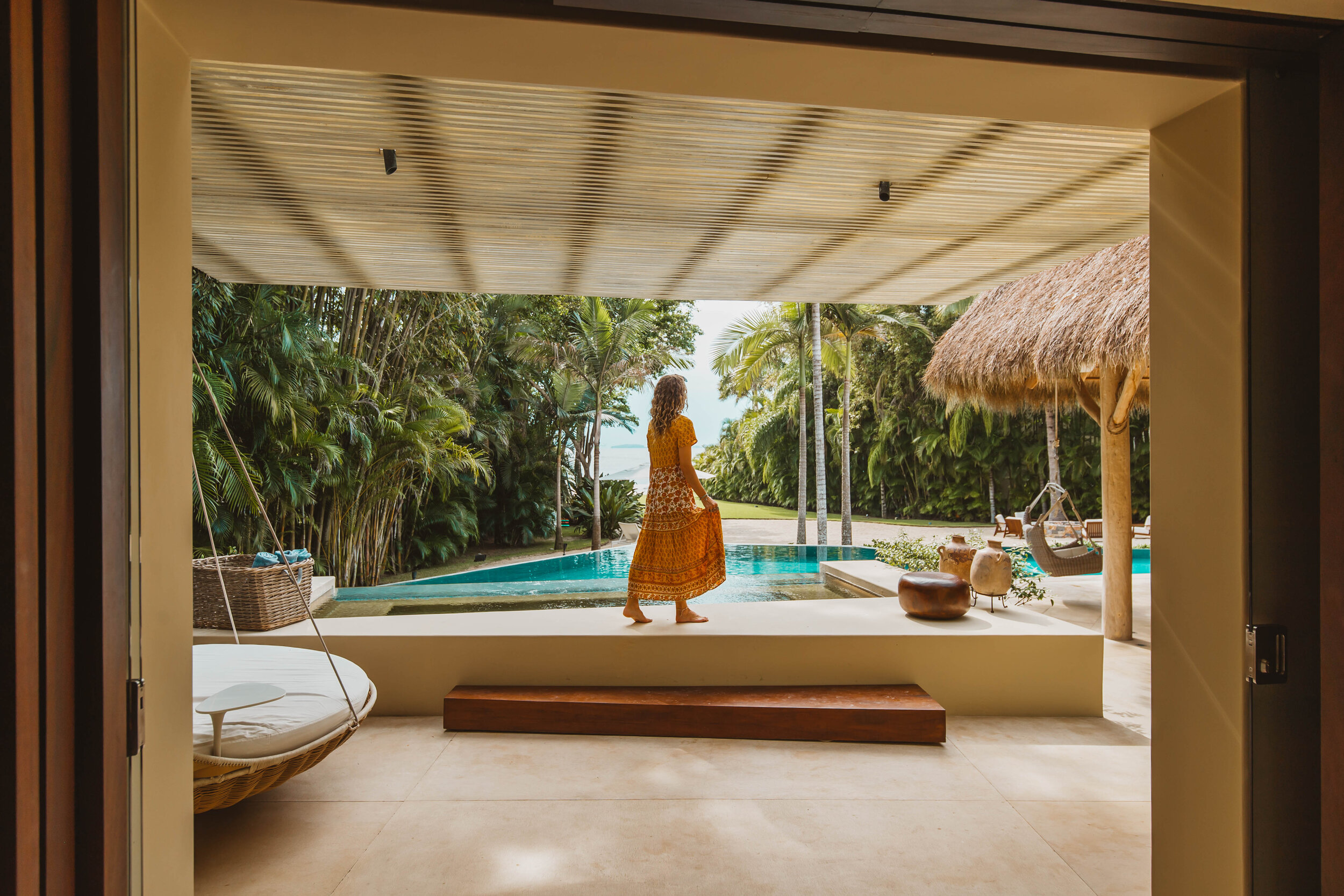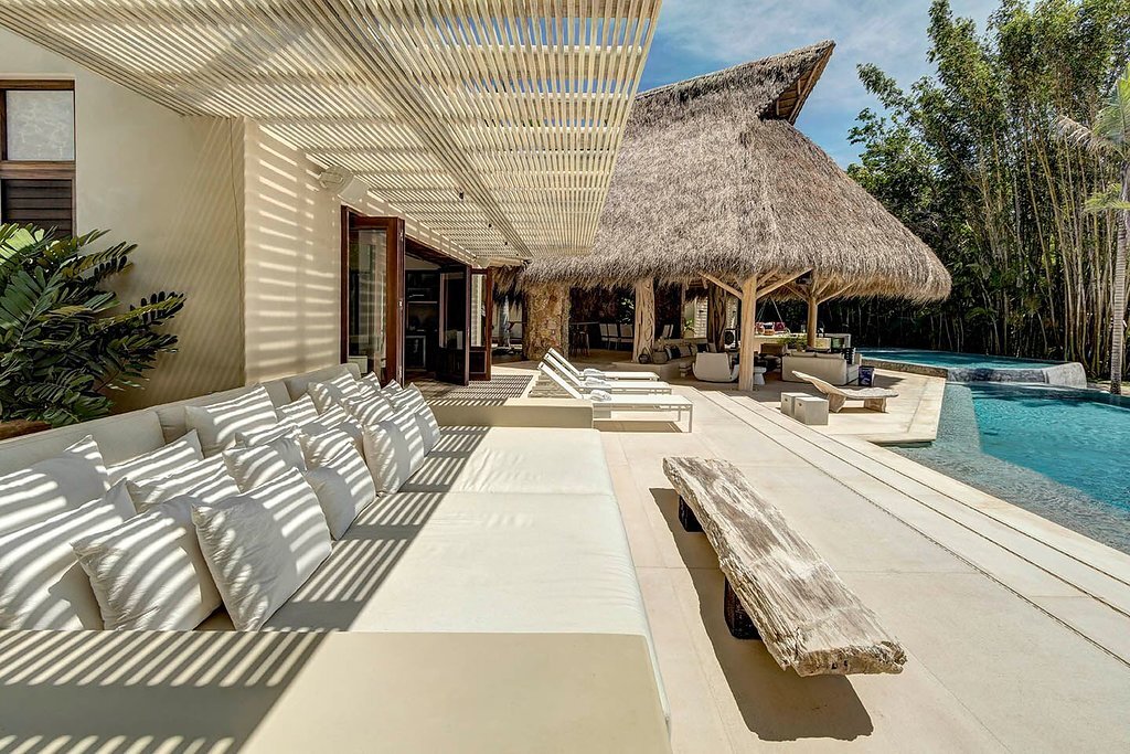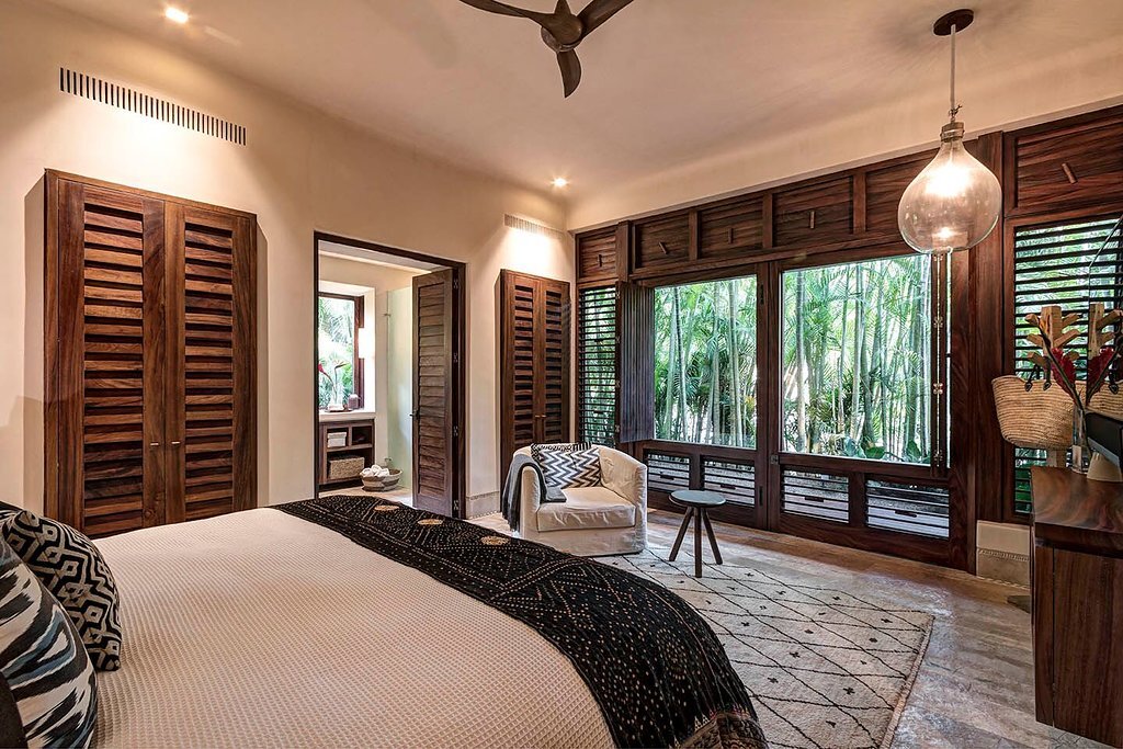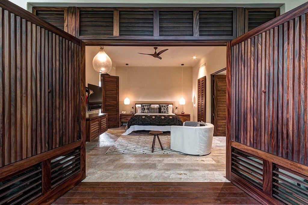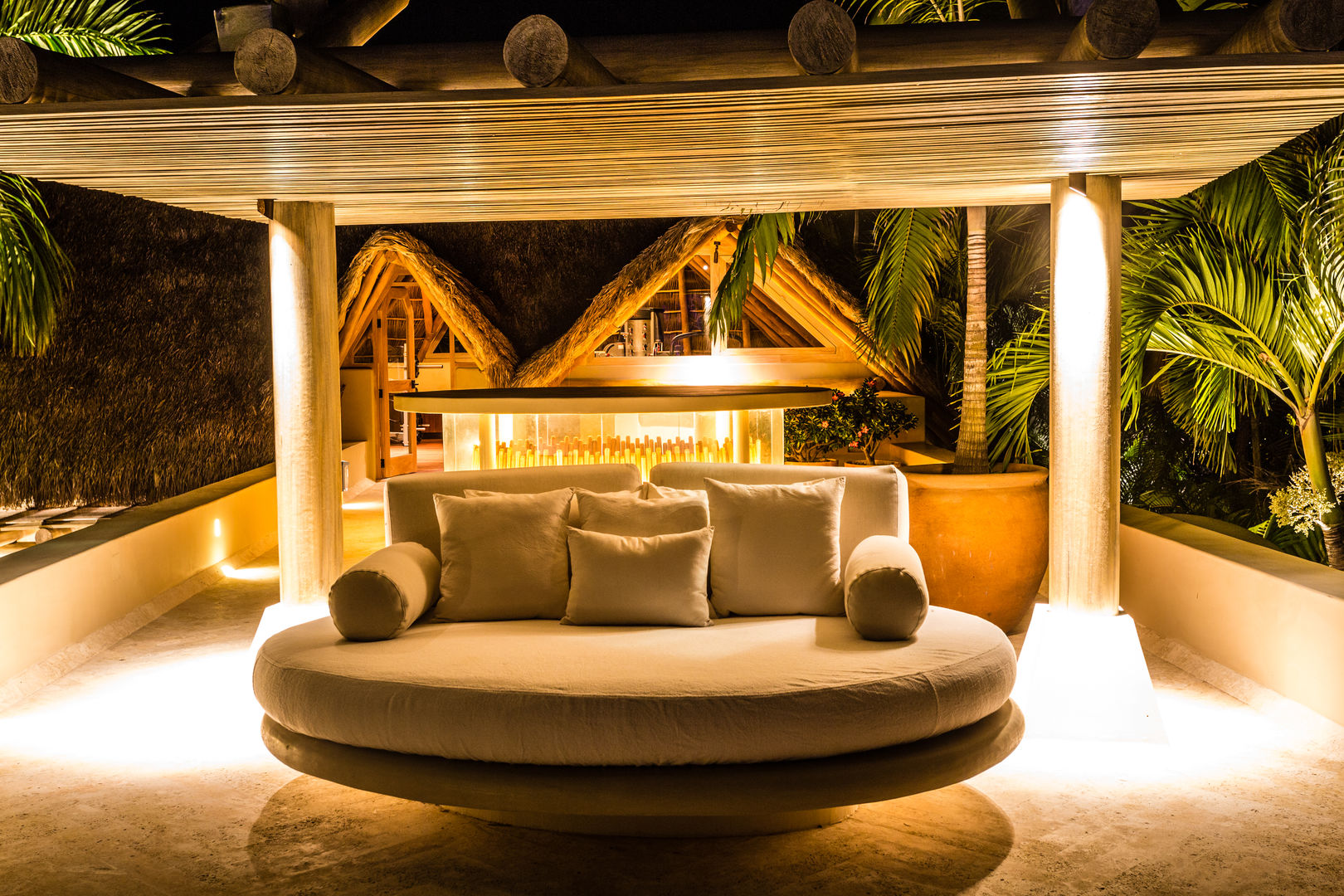 As evening approaches, ornate collapsible doors transform the indoor living and dining areas into open-air salons. These spaces extend onto terraces on either side of the villa, where soft ocean breezes set the tone for al fresco cocktails and long, lingering dinners. For a more intimate escape, a private rooftop terrace above the master suite offers a plush daybed and sweeping, unobstructed views of the boundless ocean.