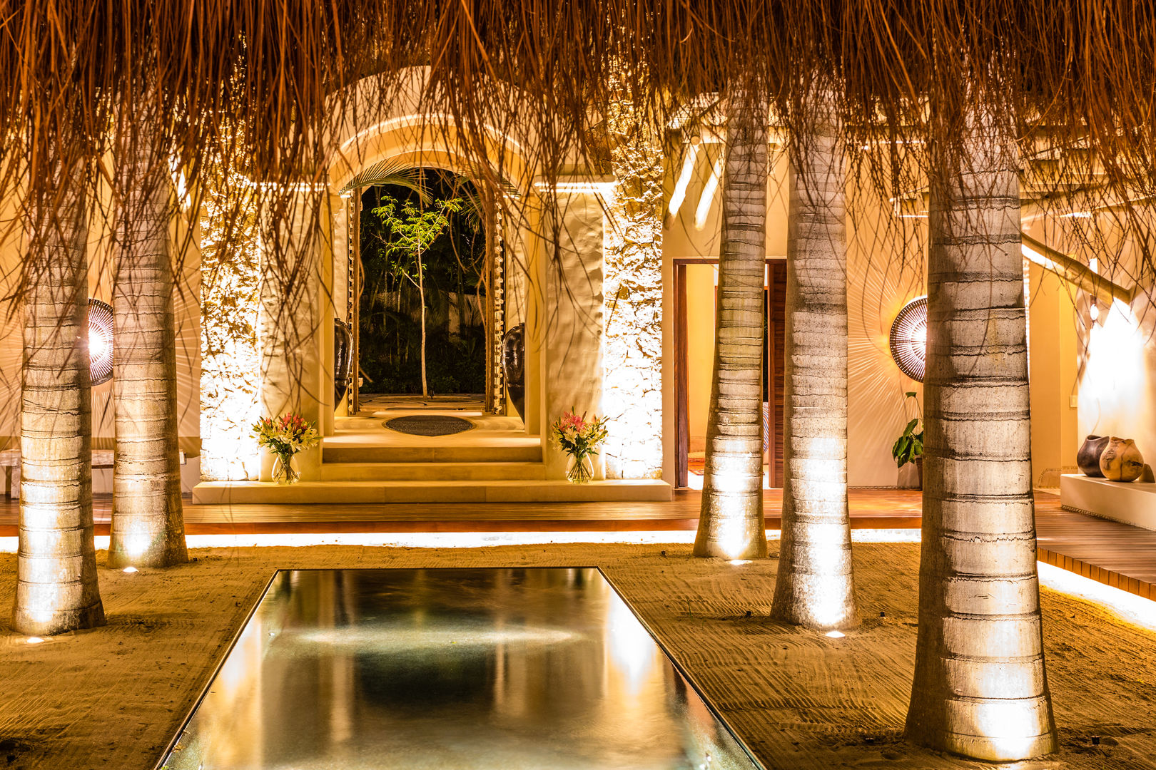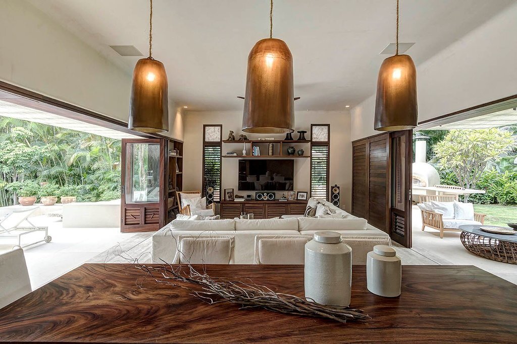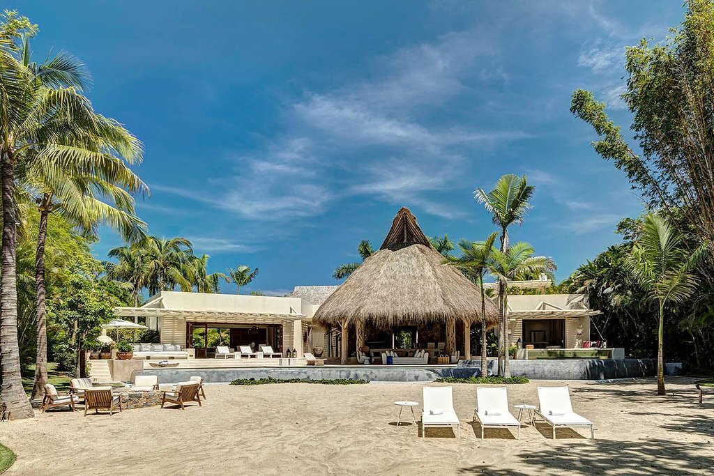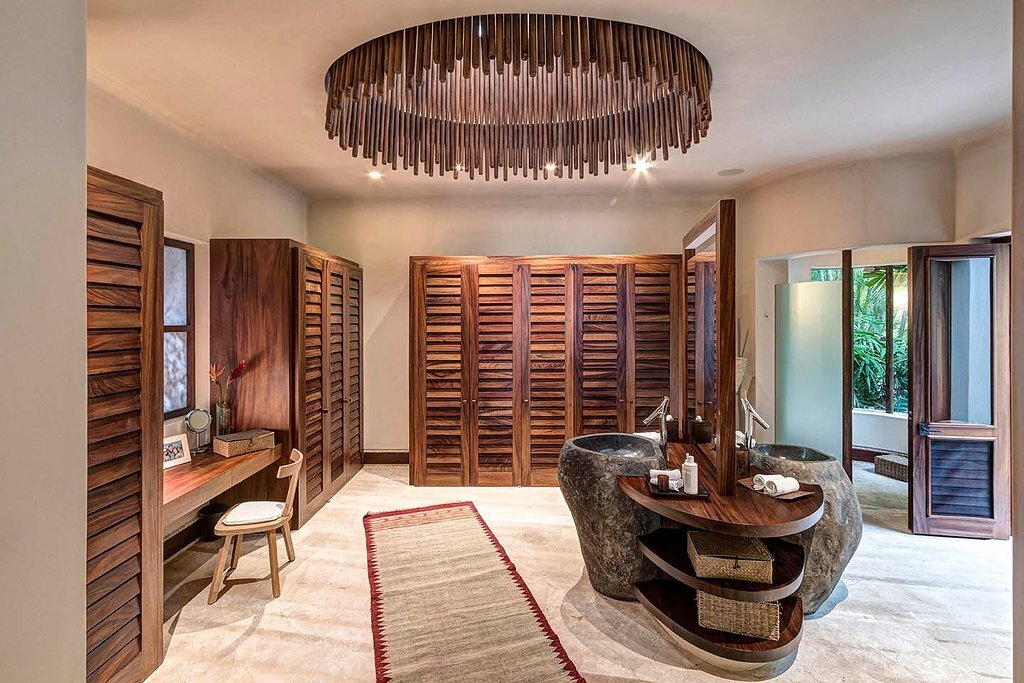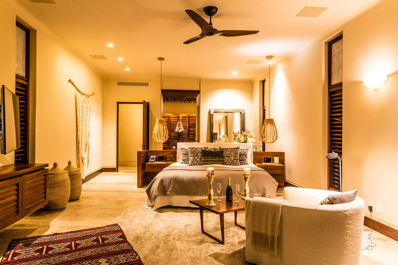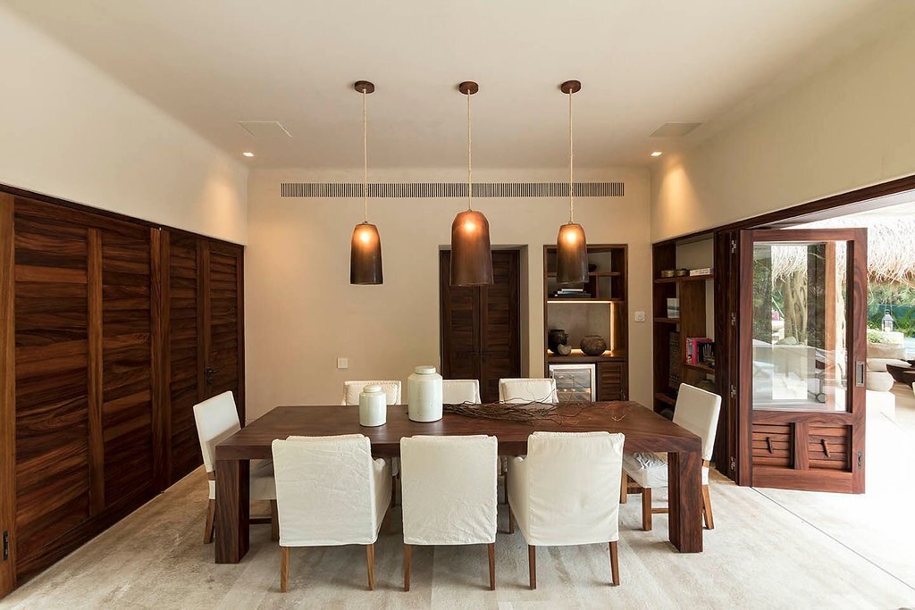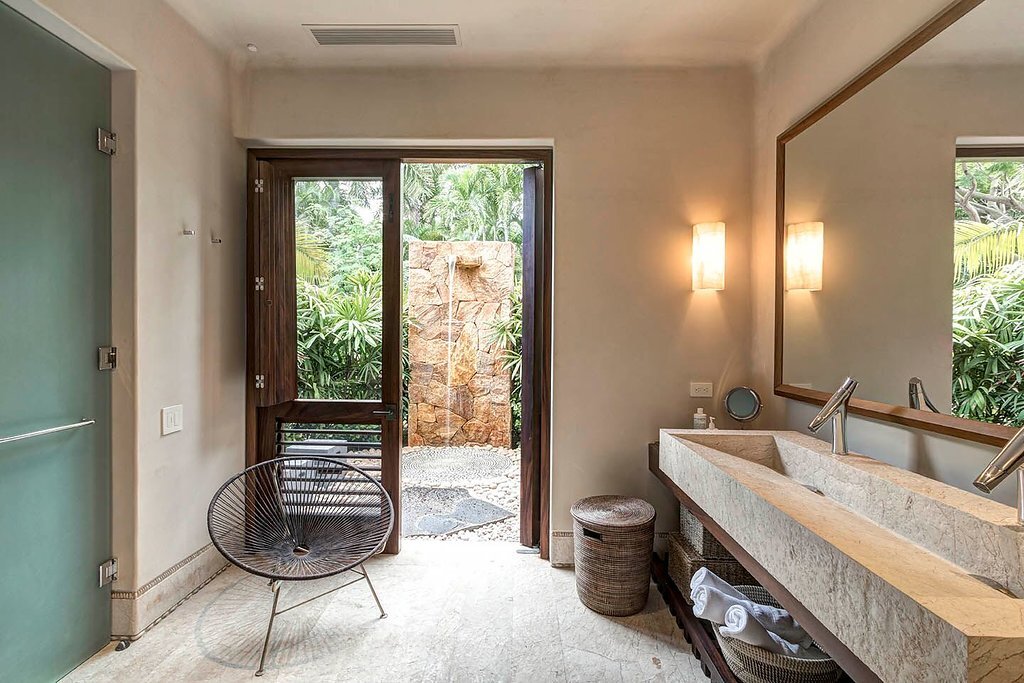 As evening approaches, ornate collapsible doors transform the indoor living and dining areas into open-air salons. These spaces extend onto terraces on either side of the villa, where soft ocean breezes set the tone for al fresco cocktails and long, lingering dinners. For a more intimate escape, a private rooftop terrace above the master suite offers a plush daybed and sweeping, unobstructed views of the boundless ocean.