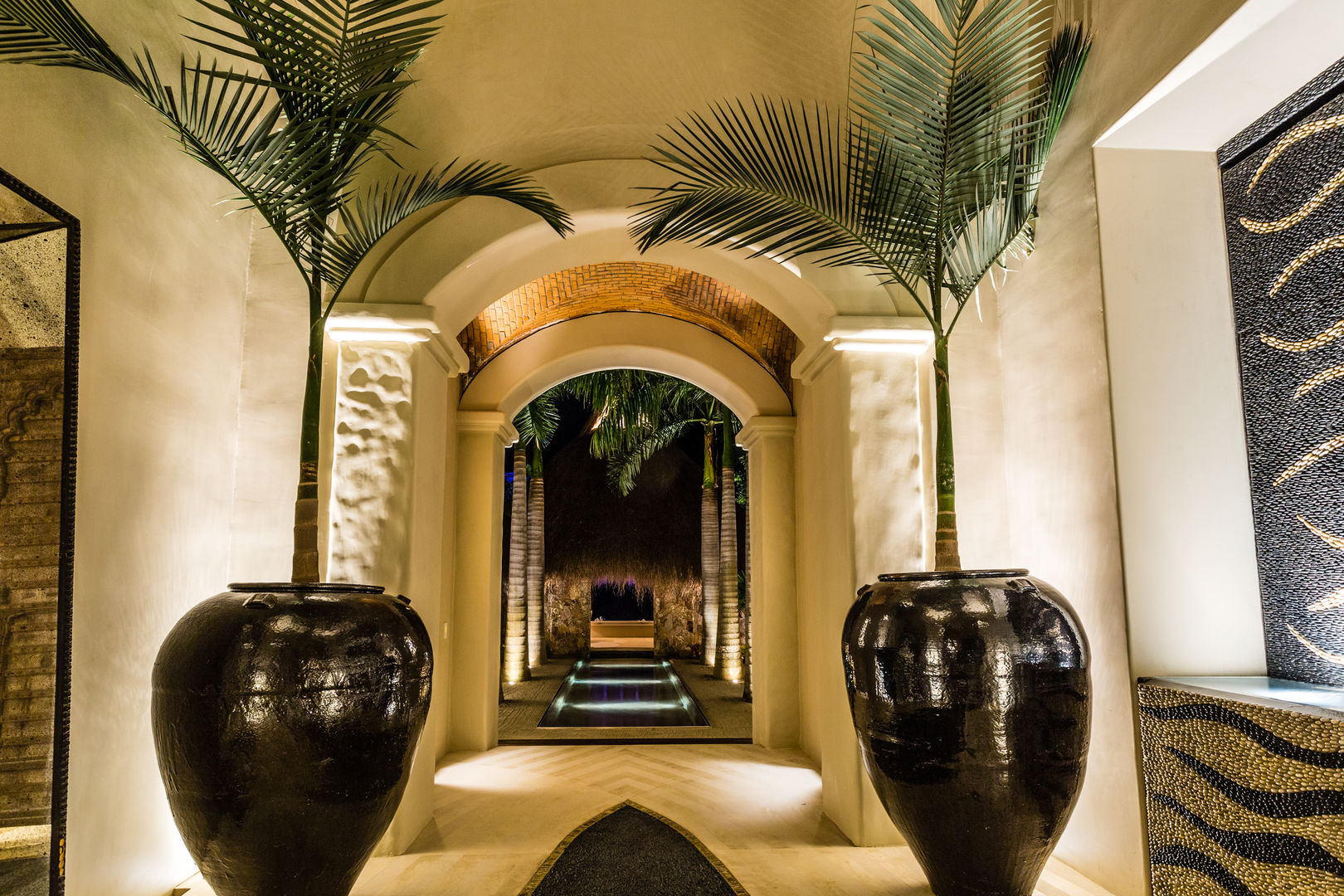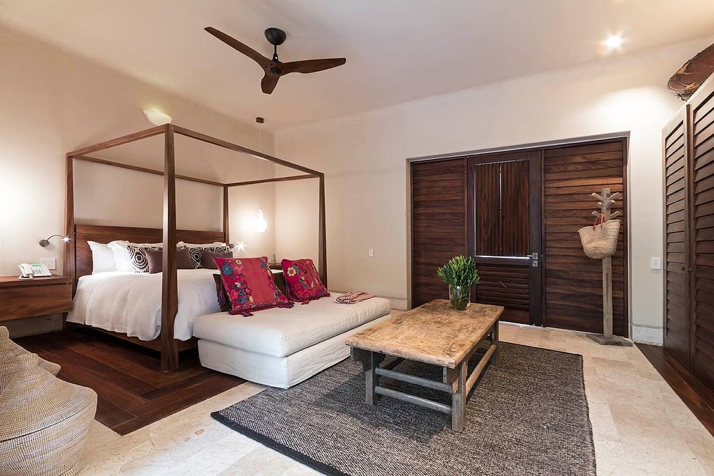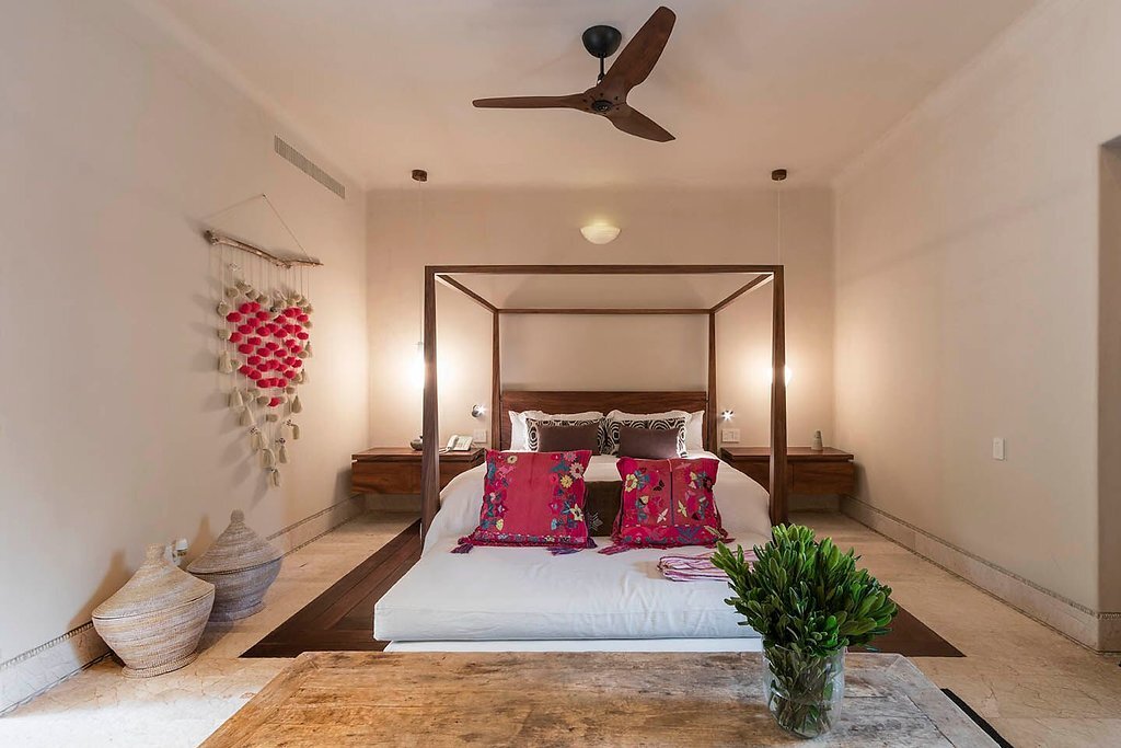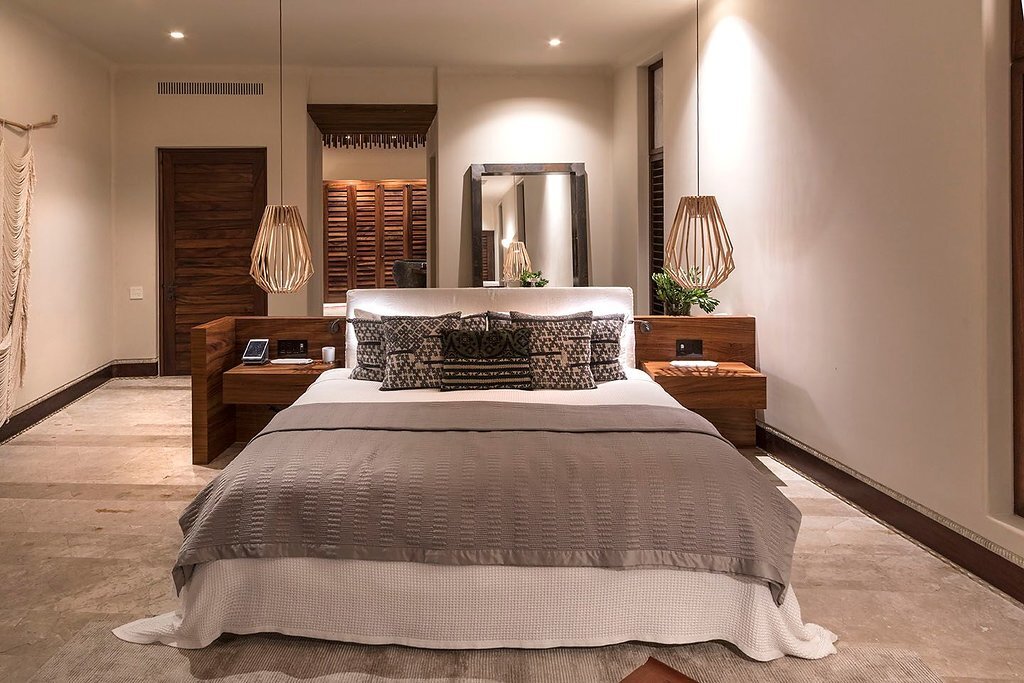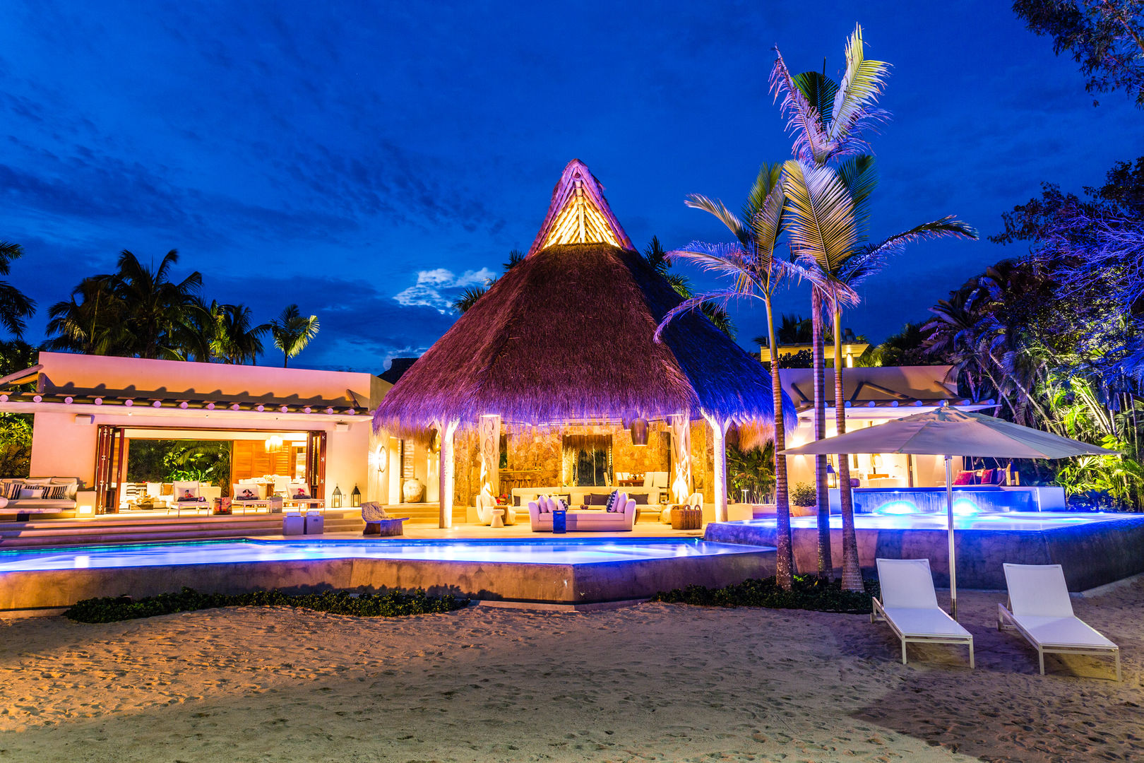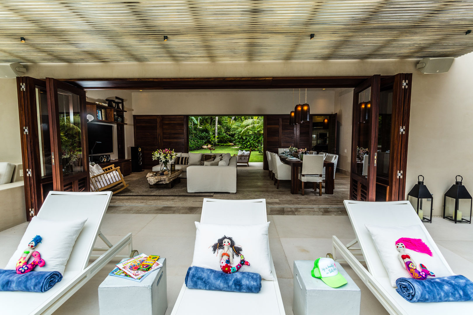 As evening approaches, ornate collapsible doors transform the indoor living and dining areas into open-air salons. These spaces extend onto terraces on either side of the villa, where soft ocean breezes set the tone for al fresco cocktails and long, lingering dinners. For a more intimate escape, a private rooftop terrace above the master suite offers a plush daybed and sweeping, unobstructed views of the boundless ocean.
