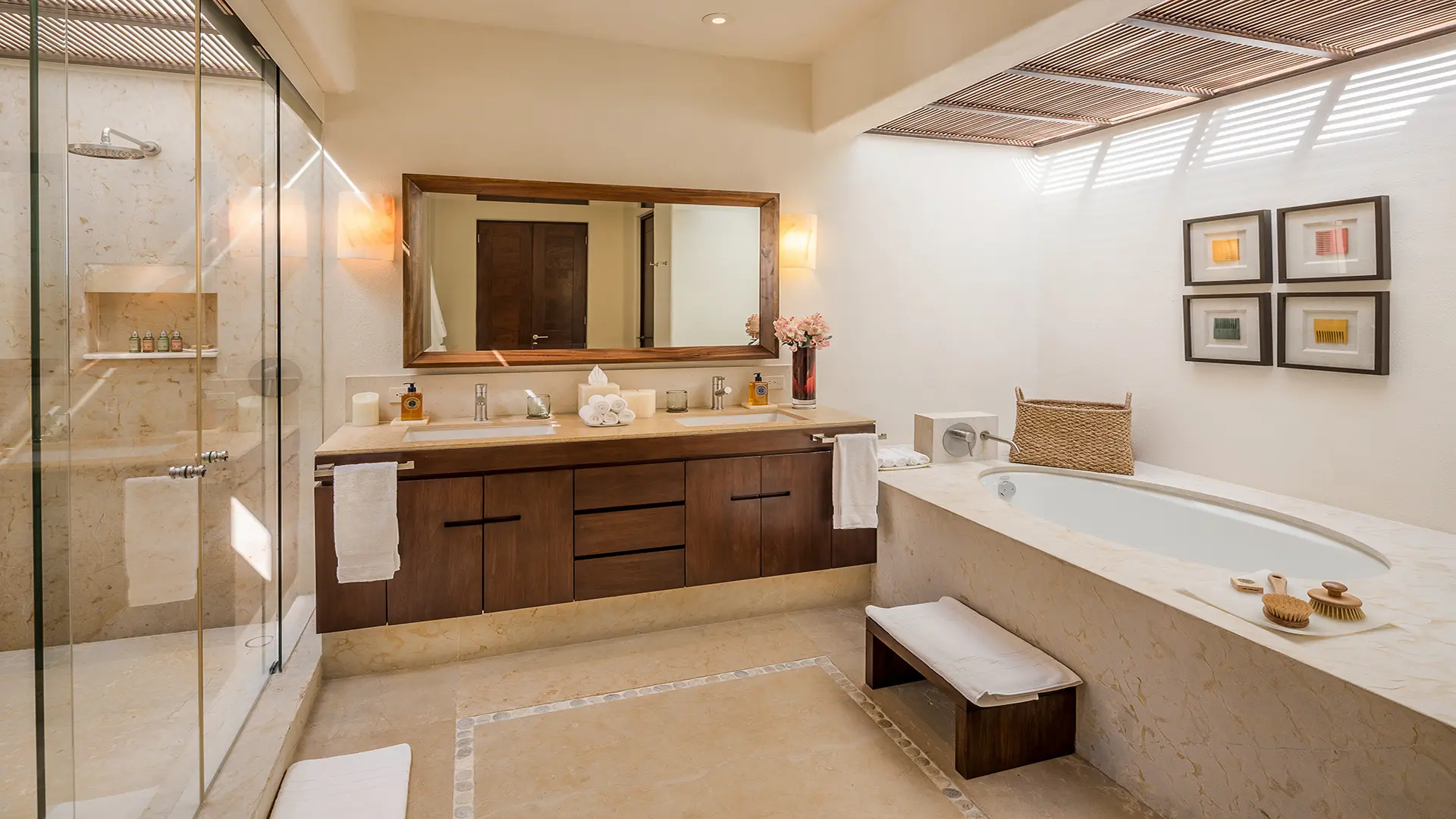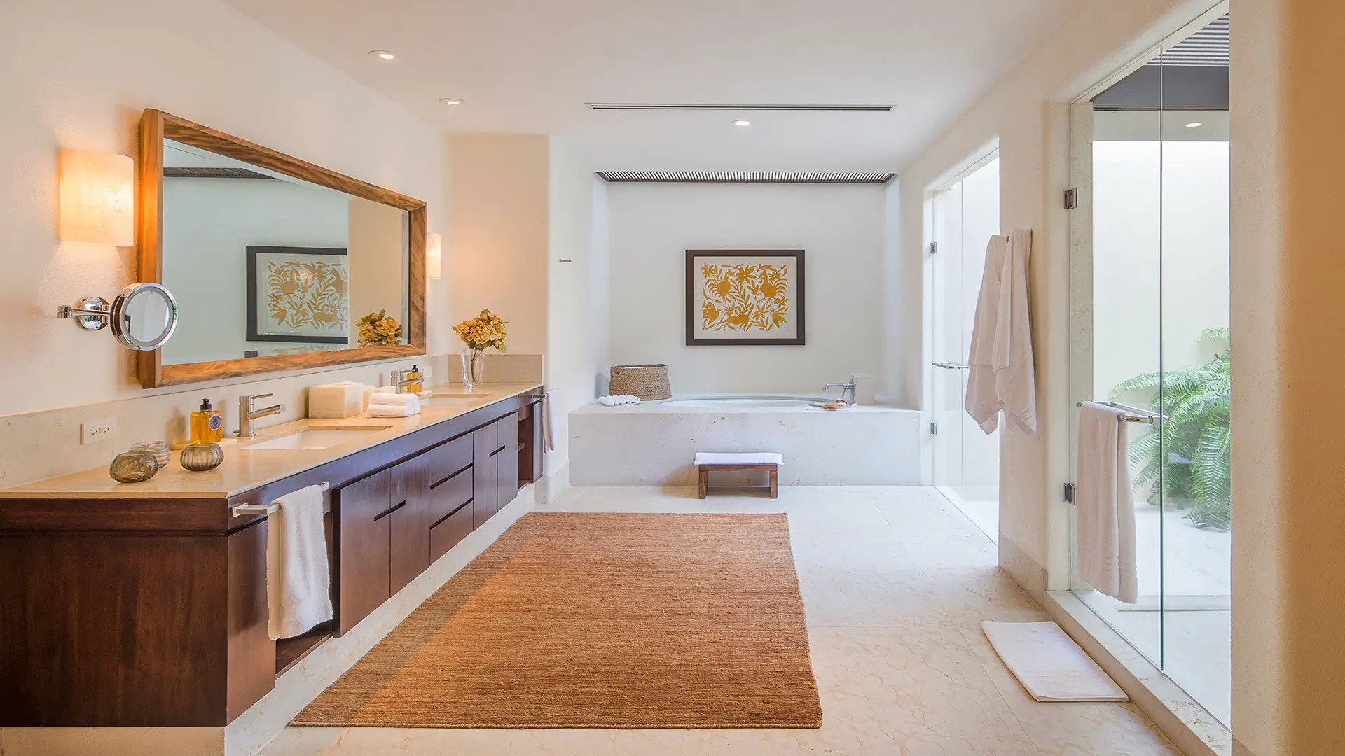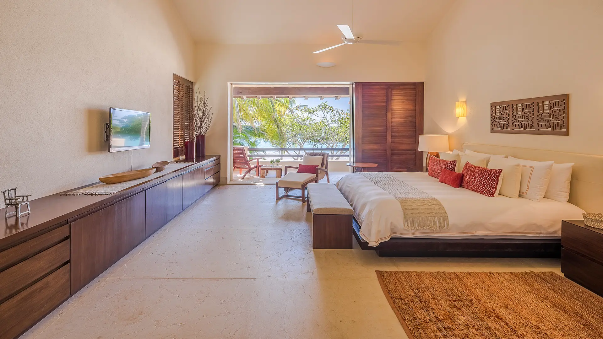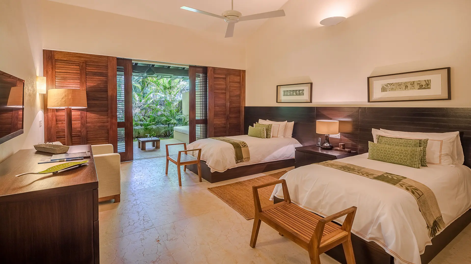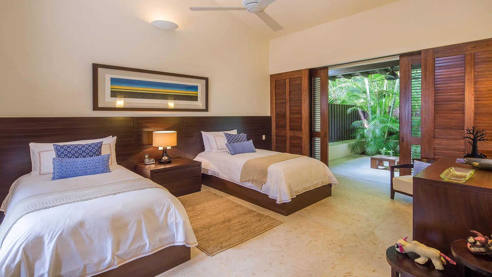 The villa features six suites and eight bathrooms, offering generous space and privacy for guests. Four suites are appointed with king-size beds and enjoy sweeping ocean views, while two additional double rooms look out toward the lush jungle. Each bedroom includes air conditioning, ceiling fans, satellite TV, DVD, Apple TV, a telephone, Wi‑Fi access, a terrace, a walk‑in closet, double vanity, and bathtub, creating a comfortable and well-equipped sanctuary for rest and retreat.