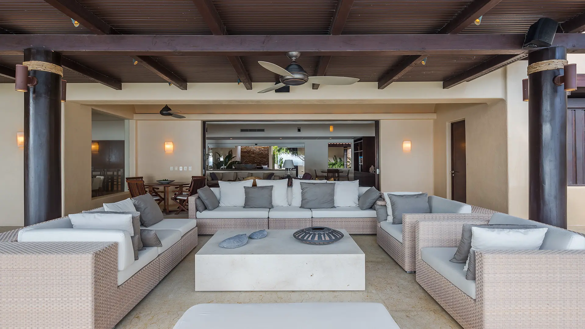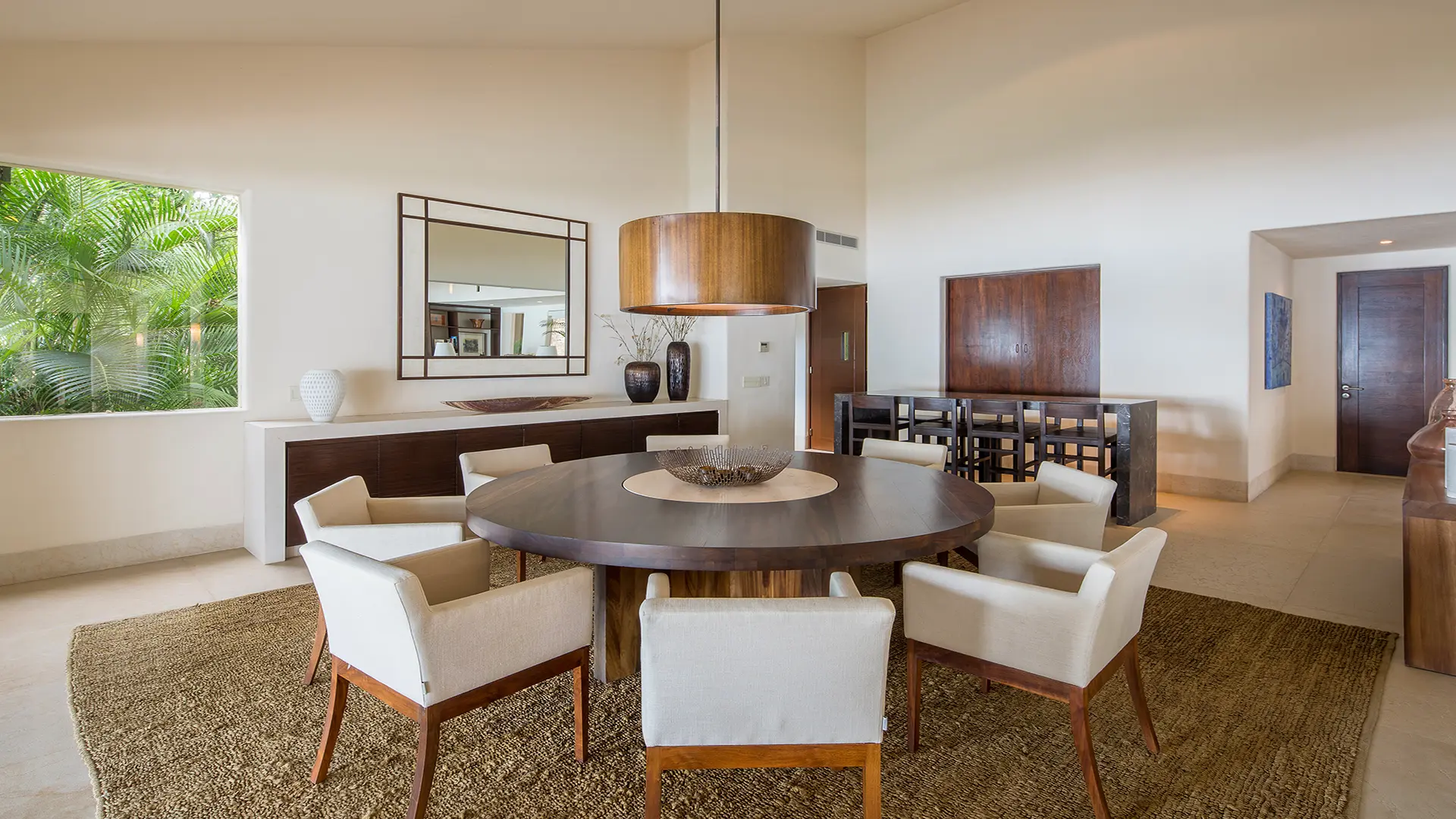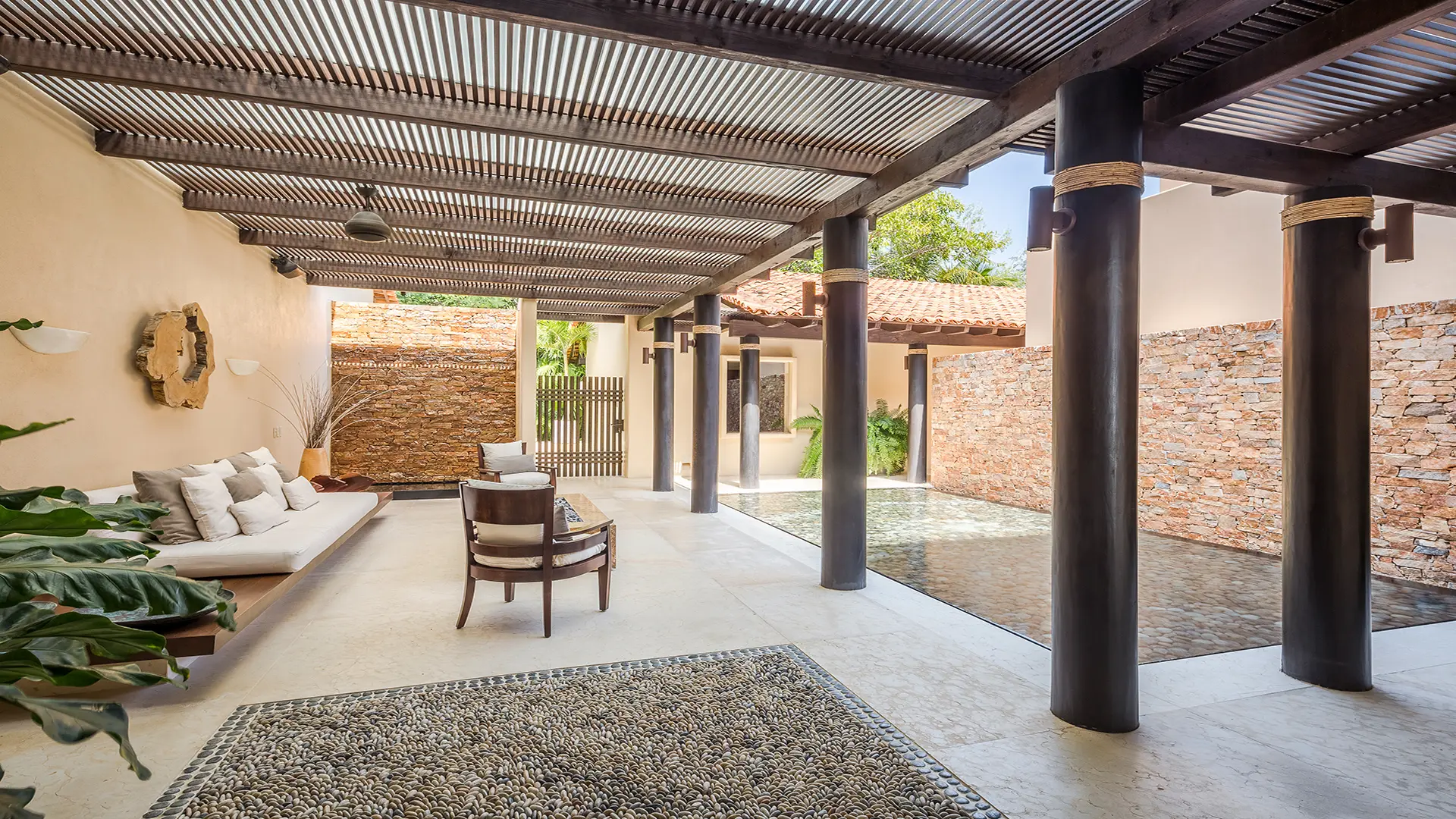 Casa Manzanillas is thoughtfully designed for both indoor and outdoor living. A stylish living room, indoor and outdoor dining areas, and a fully equipped kitchen flow seamlessly toward the terrace. Sliding doors separate the kitchen from the terrace, allowing guests to relax under the pergola with drinks while a personal chef prepares meals inside. The décor throughout is described as exquisite, complementing the villa’s spectacular views of the Mexican Pacific.