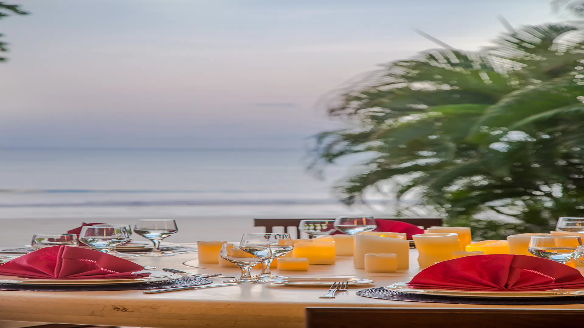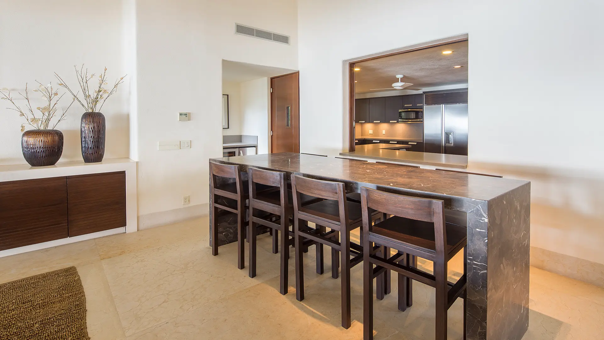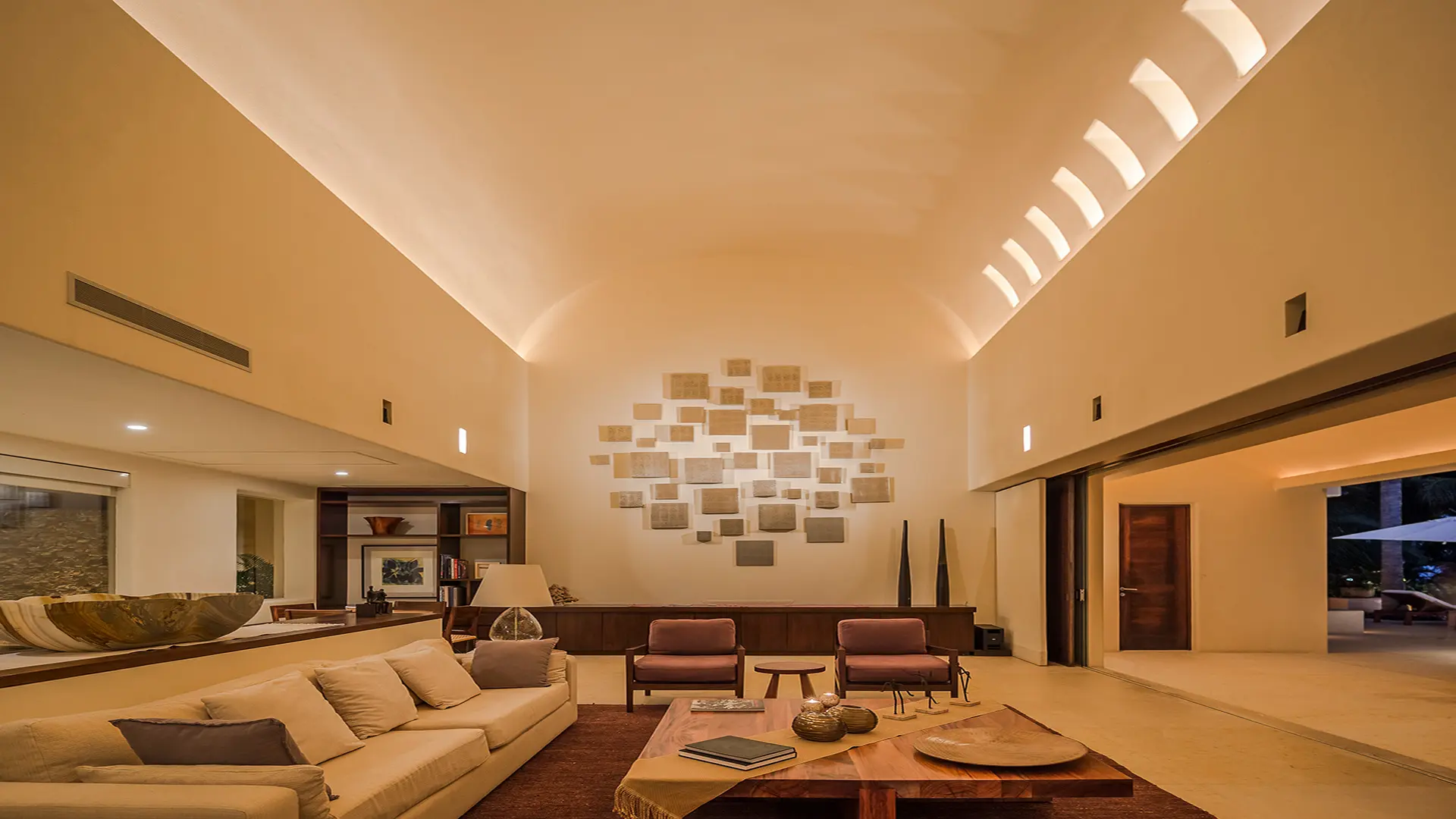 Casa Manzanillas is thoughtfully designed for both indoor and outdoor living. A stylish living room, indoor and outdoor dining areas, and a fully equipped kitchen flow seamlessly toward the terrace. Sliding doors separate the kitchen from the terrace, allowing guests to relax under the pergola with drinks while a personal chef prepares meals inside. The décor throughout is described as exquisite, complementing the villa’s spectacular views of the Mexican Pacific.